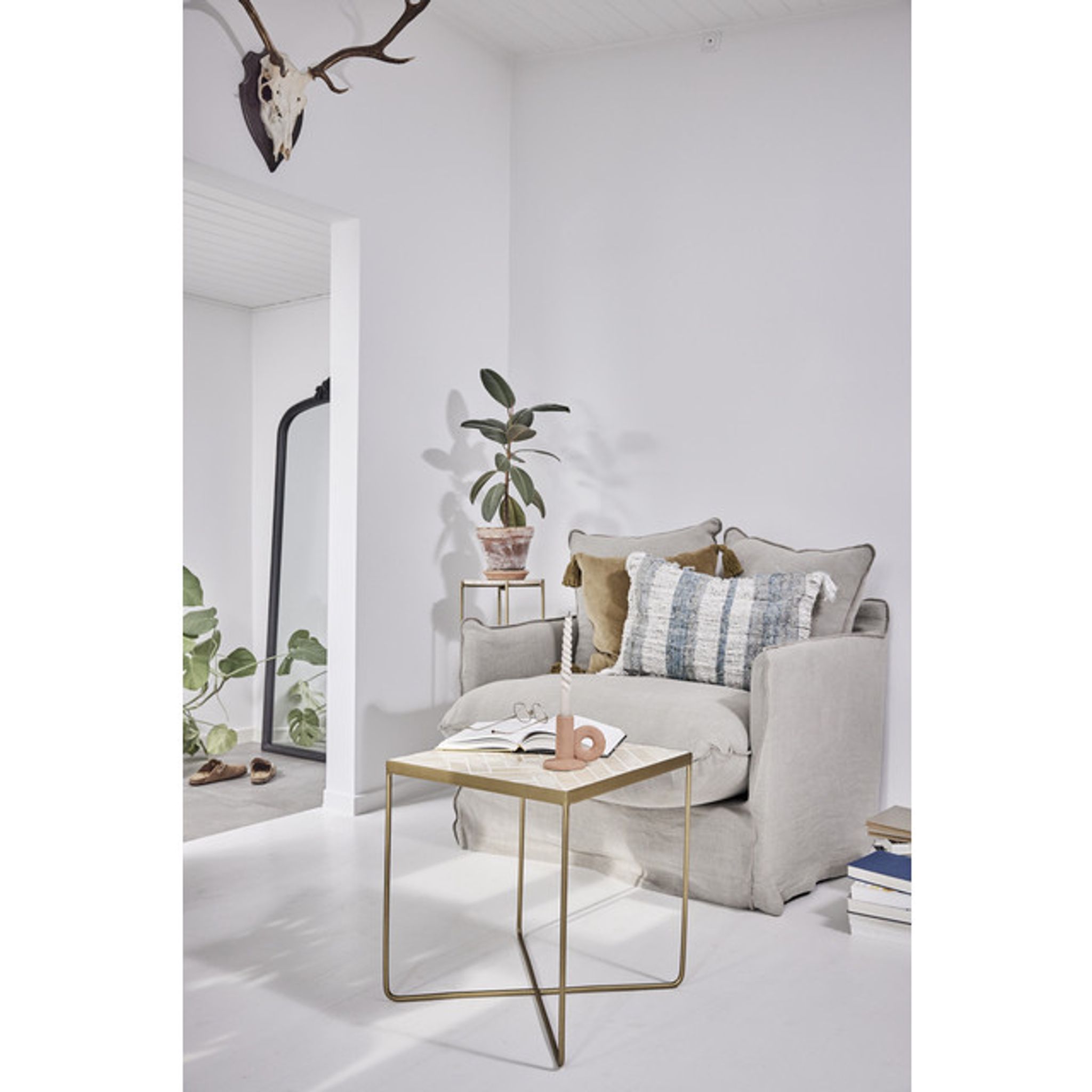 Travertinskivan är slitstark och lämpad för vardagsanvändning, samtidigt som kombinationen av sten och guldfärgade ben ger en modernare känsla i rummet. Som sidobord förenklar de din vardag genom att ge plats för prydnadssaker eller snacks och frigör ytor i resten av rummet.