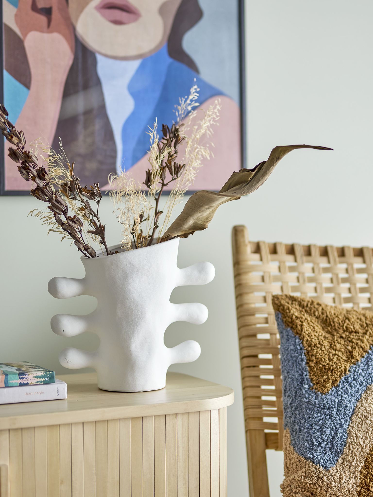 Pernilla-vasen från Bloomingville är en vit stengodsvas med skulptural form som passar som mittpunkt i ditt vardagsrum, på matbordet eller på en öppen hylla. Den är gjord för större buketter och ger din inredning en enkel, genomtänkt detalj som lyfter rummet.