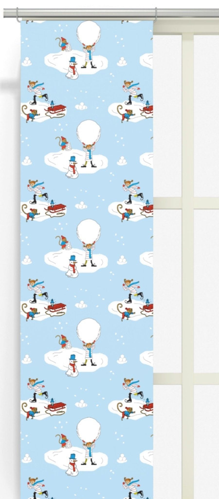 Pippi Åker Skridskor – ljusblå panellängd i 2-pack från Arvidssons Textil. Tillverkad i mjuk bomull med motiv av Astrid Lindgren, vilket gör rummet varmt, lekfullt och mysigt för barnen. Perfekt som fönsterpanel i barnrummet eller lekstugan och enkelt att tvätta och underhålla.