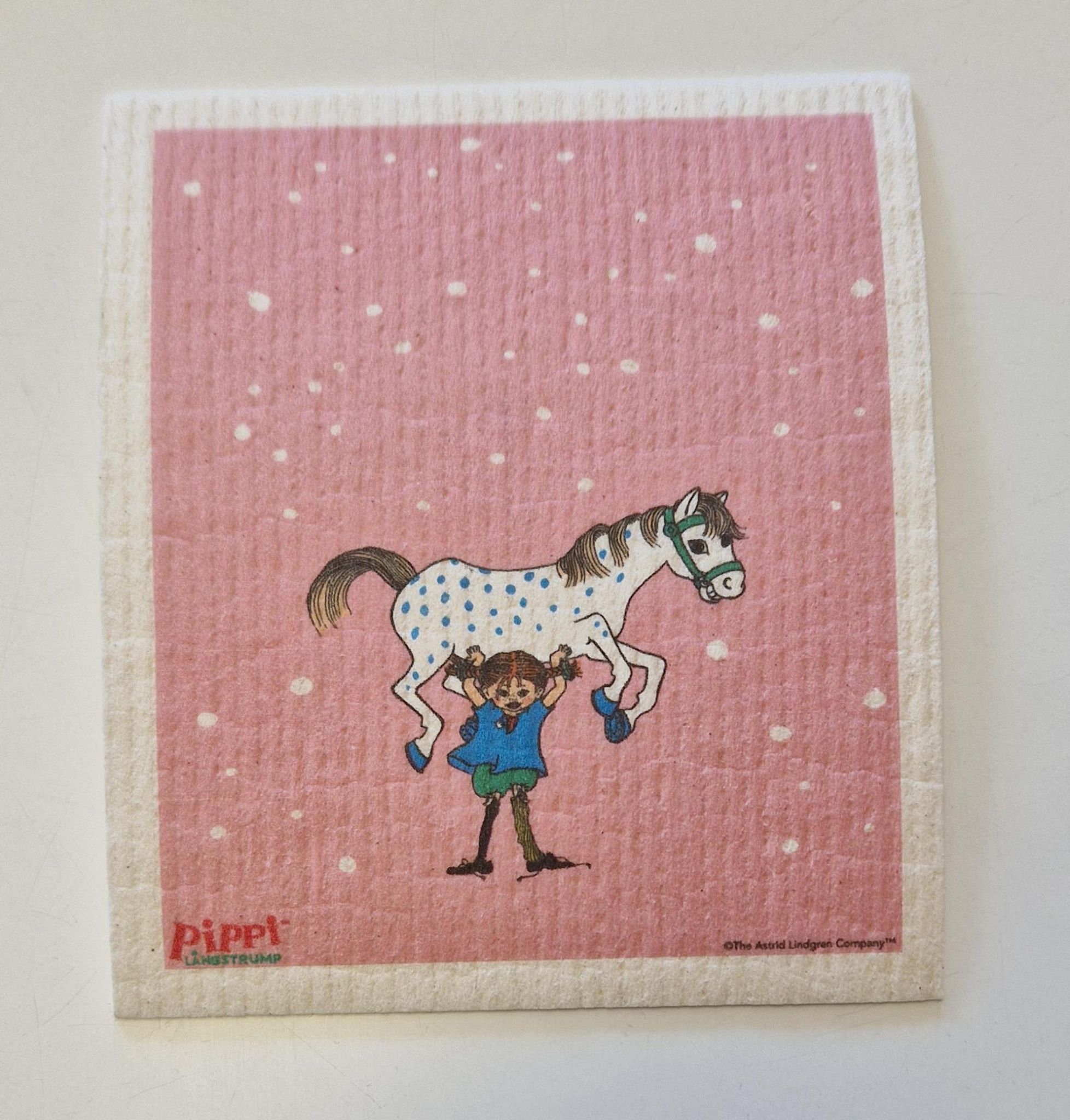 Pippi Med Vänner rosa disktrasa från Arvidssons Textil är en lekfull och praktisk disktrasa i rosa nyans med motiv från Pippi Långstrump. Tillverkad i en naturlig blandning av cellulosa och bomull ger den bra absorbens och en mjuk känsla mot händerna – perfekt för daglig disk och köksrengöring.
