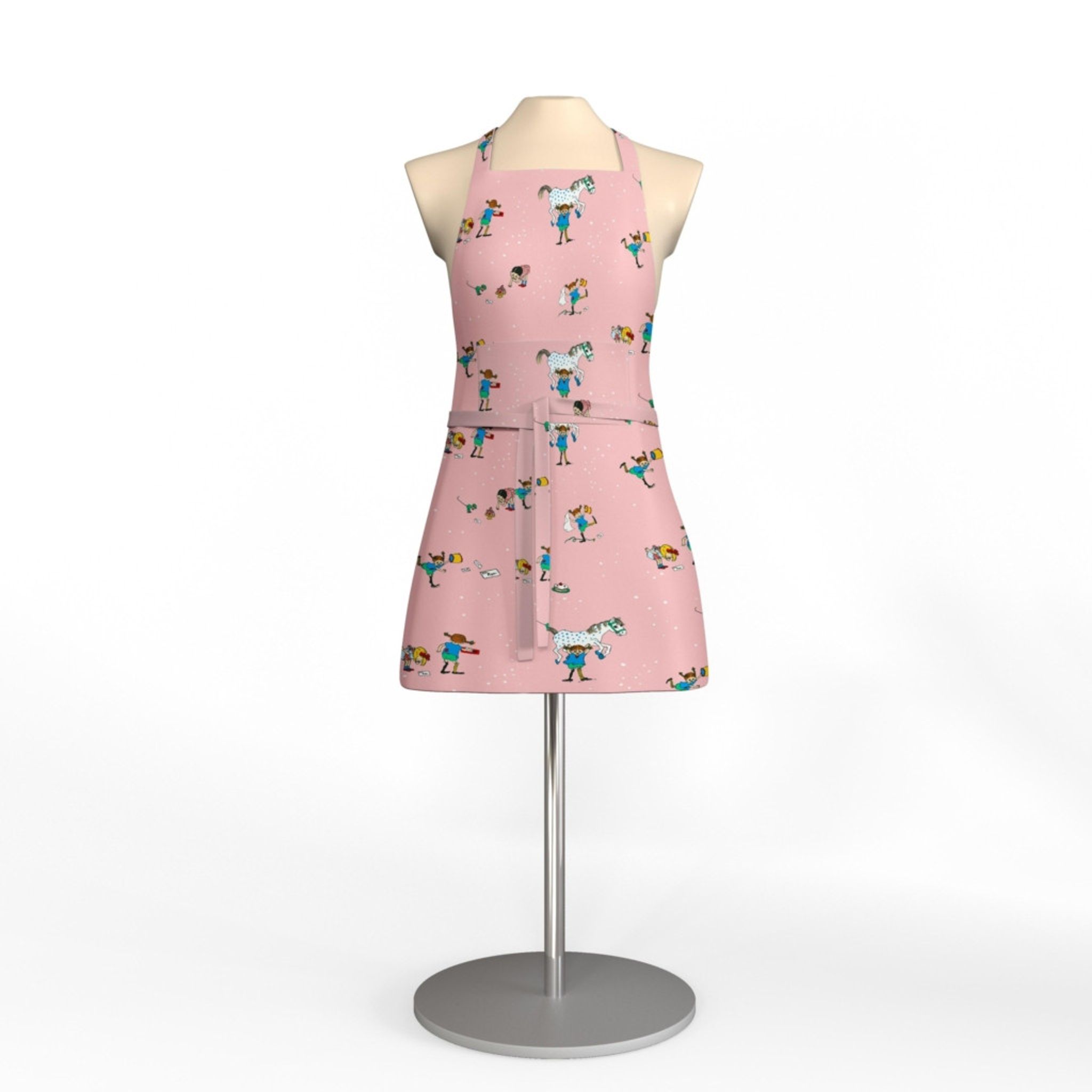 Pippi Med Vänner rosa förkläde med ficka från Arvidssons Textil i 100% bomull. Ett lekfullt och praktiskt förkläde i rosa färg med Astrid Lindgrens Pippi-motiv. Skyddar kläderna vid bakning, matlagning och pyssel och har en praktisk ficka vid midjan för små redskap och receptkort.