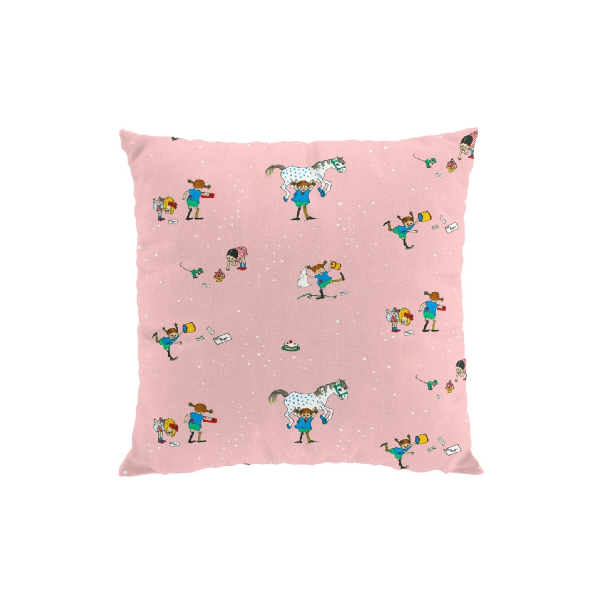 Pippi Med Vänner rosa kuddfodral från Arvidssons Textil i 100% bomull. Lekfull design av Astrid Lindgren, perfekt för barnrum och som present.