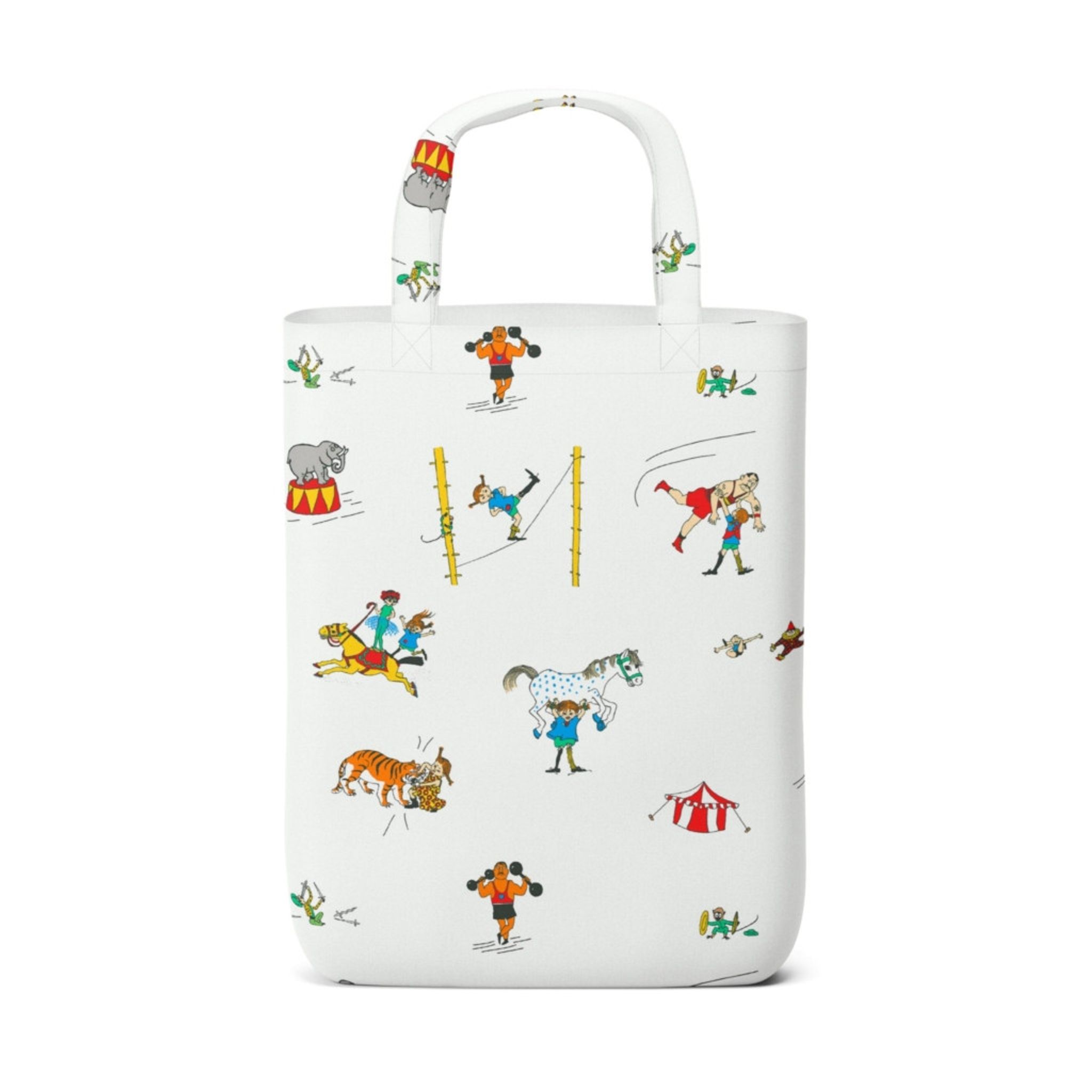 Pippi På Cirkus offwhite kasse från Arvidssons Textil – en lekfull tygkasse i bomull. Designad av Astrid Lindgren och perfekt som shoppingväska, vardagskasse eller strandväska.