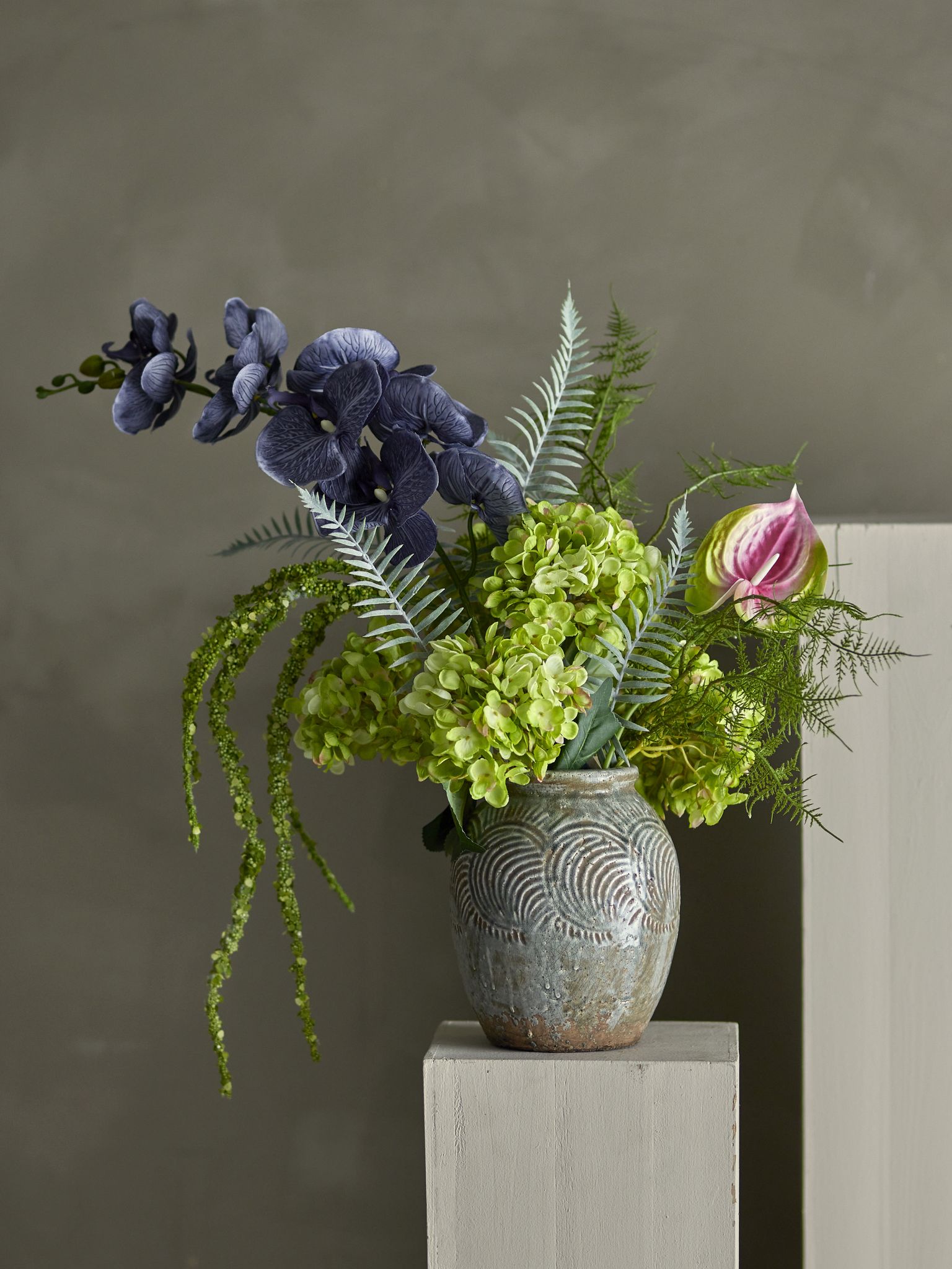 Poetry-buketten från Bloomingville är en konstgjord bukett i blått och grönt som ger färg och form i ditt hem utan skötsel. Den passar på vardagsrumsbordet, i hallen, på köksbänken eller som en dekordetalj på kontoret — när du vill ha en snygg inredningsdetalj utan att tänka på vattning.
