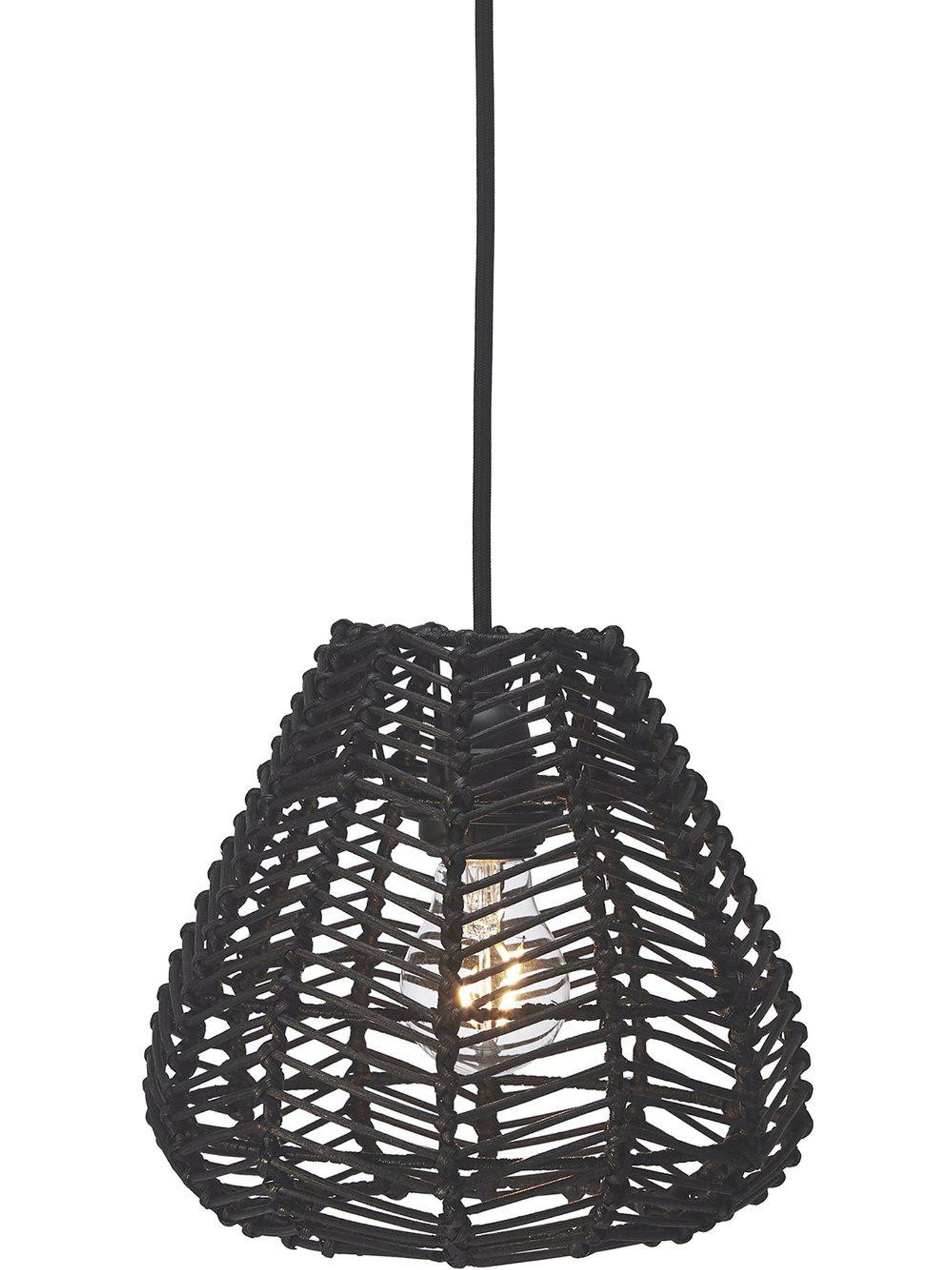 Adelle handflätad svart taklampa i rotting, 24 cm bred och 25 cm hög, med E27-fäste. Den passar i ditt vardagsrum eller över matbordet, funkar bra som inomhusbelysning, är praktisk, snygg och håller länge.