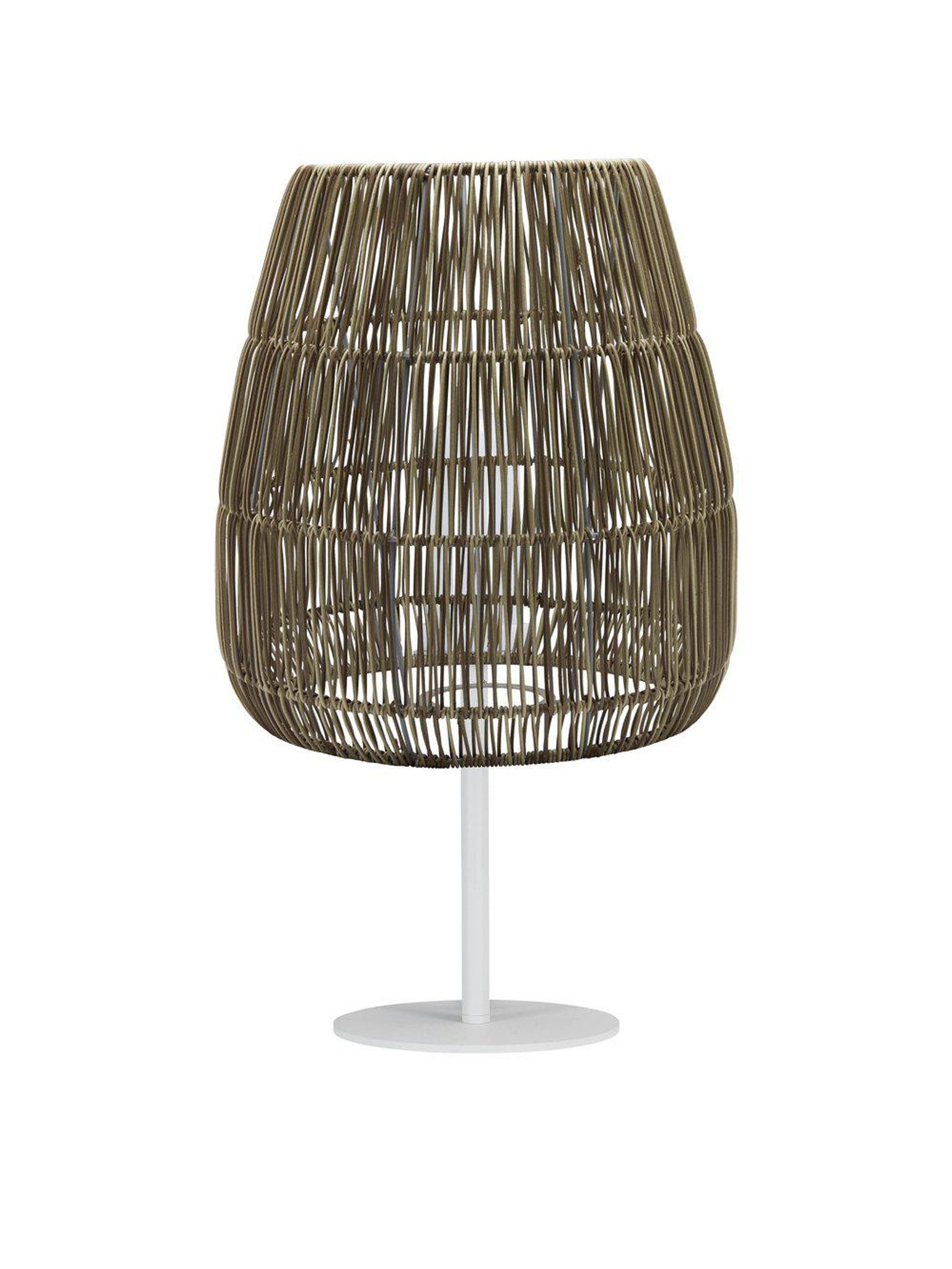 Utomhusbordslampa i beige metall, 71 cm hög med E27-sockel och flätad skärm, sladd 200 cm. Den är snygg och praktisk, passar din uteplats eller trädgård, funkar bra och håller länge.