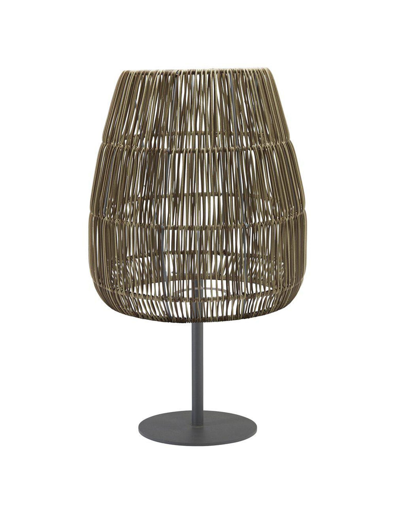 Den här beige metallampan med flätad skärm är en utomhusbordslampa för din uteplats, balkong eller trädgårdsmöbel. Den passar när du vill skapa en varm stämning på kvällarna och samtidigt ha en hållbar lösning för utomhusbelysning.