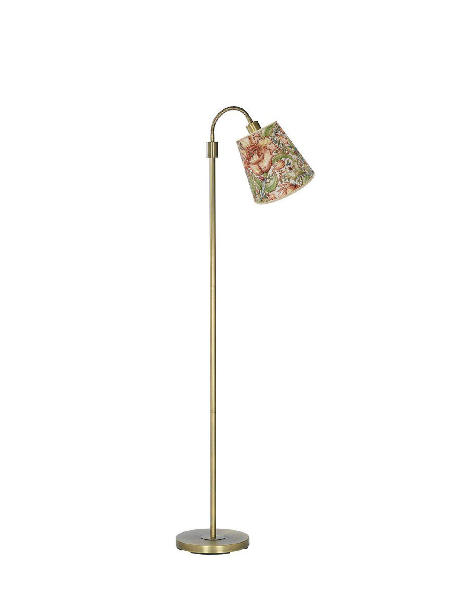 En justerbar golvlampa i antikmässing med E27-lamphållare och medföljande Cia toppringskärm (20 cm). Den passar i vardagsrum, läshörna eller sovrum och ger både läs- och stämningsbelysning där du behöver den.
