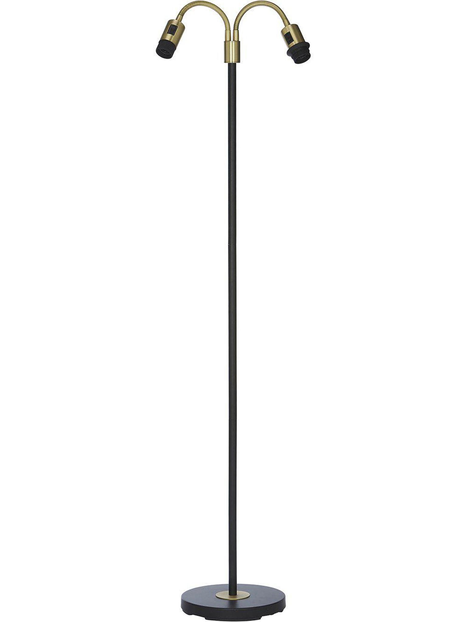 Svart metallgolvlampa 150 cm med E27-sockel och två justerbara armar, 190 cm sladd, enkel montering. Snygg och praktisk lampa som håller länge, passar i vardagsrum eller läshörna och funkar bra i ditt hem.