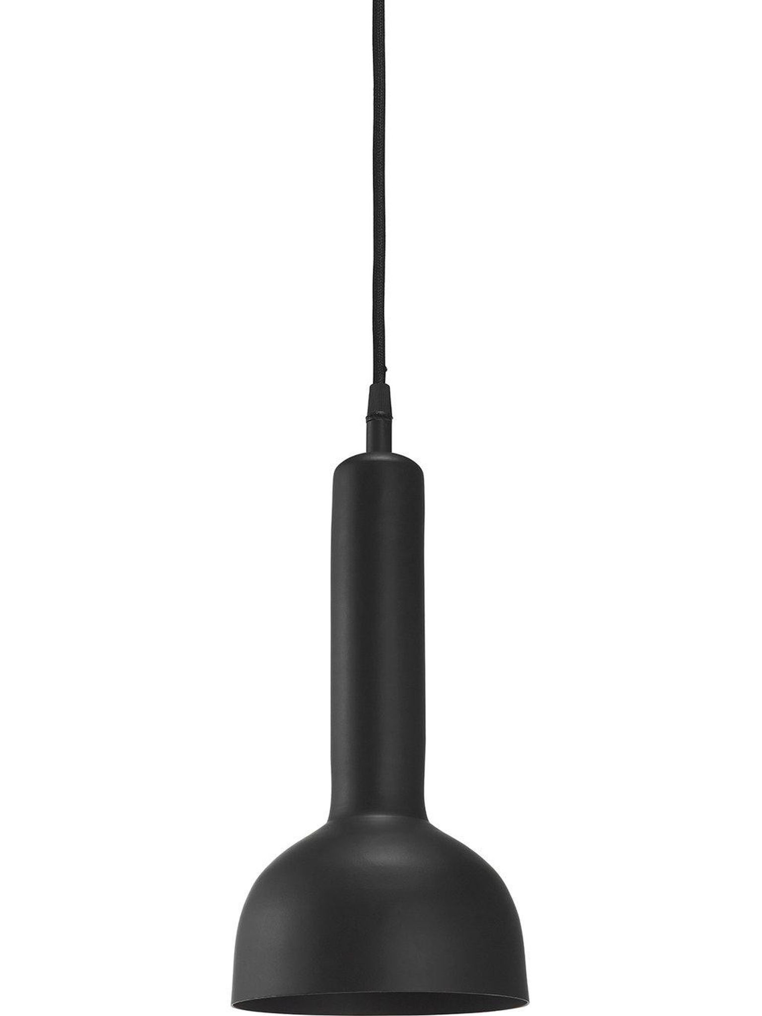 Svart pendellampa Bainbridge i gjuten metall, 32 cm hög, 15 cm bred, 350 cm textilsladd. Den är snygg, praktisk och passar i ditt kök eller din hall; funkar som taklampa, bra och håller länge.
