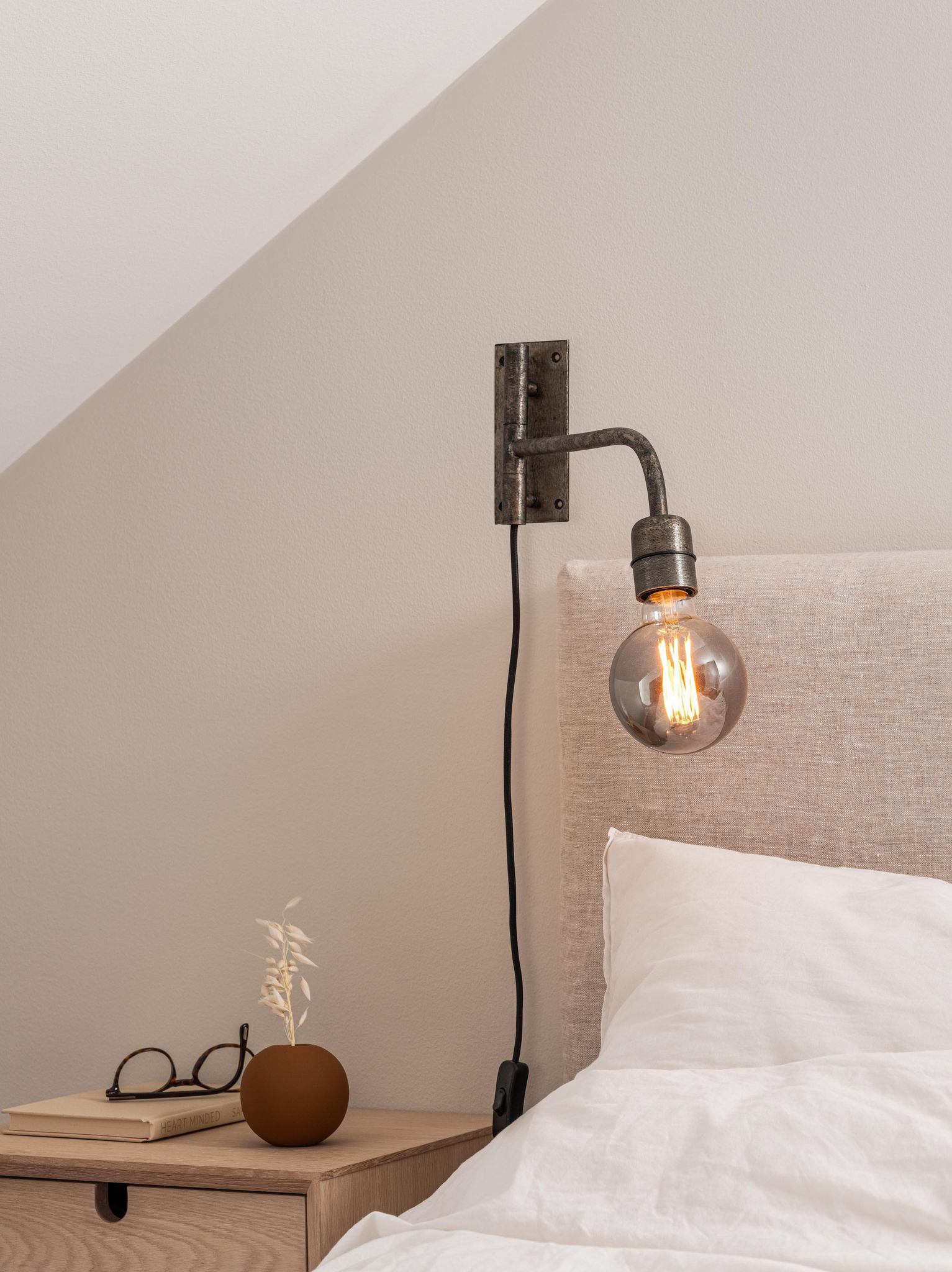 Denna vägglampa kombinerar funktion och form på ett genomtänkt sätt. Den justerbara armen gör den användbar som läslampa vid sängen eller i en mysig hörna, samtidigt som den funkar som allmän väggbelysning i hall eller vardagsrum. Med E27-sockeln väljer du själv om du vill ha stjärnakt arbetsljus eller varmare, mjukare ljus för avkoppling.