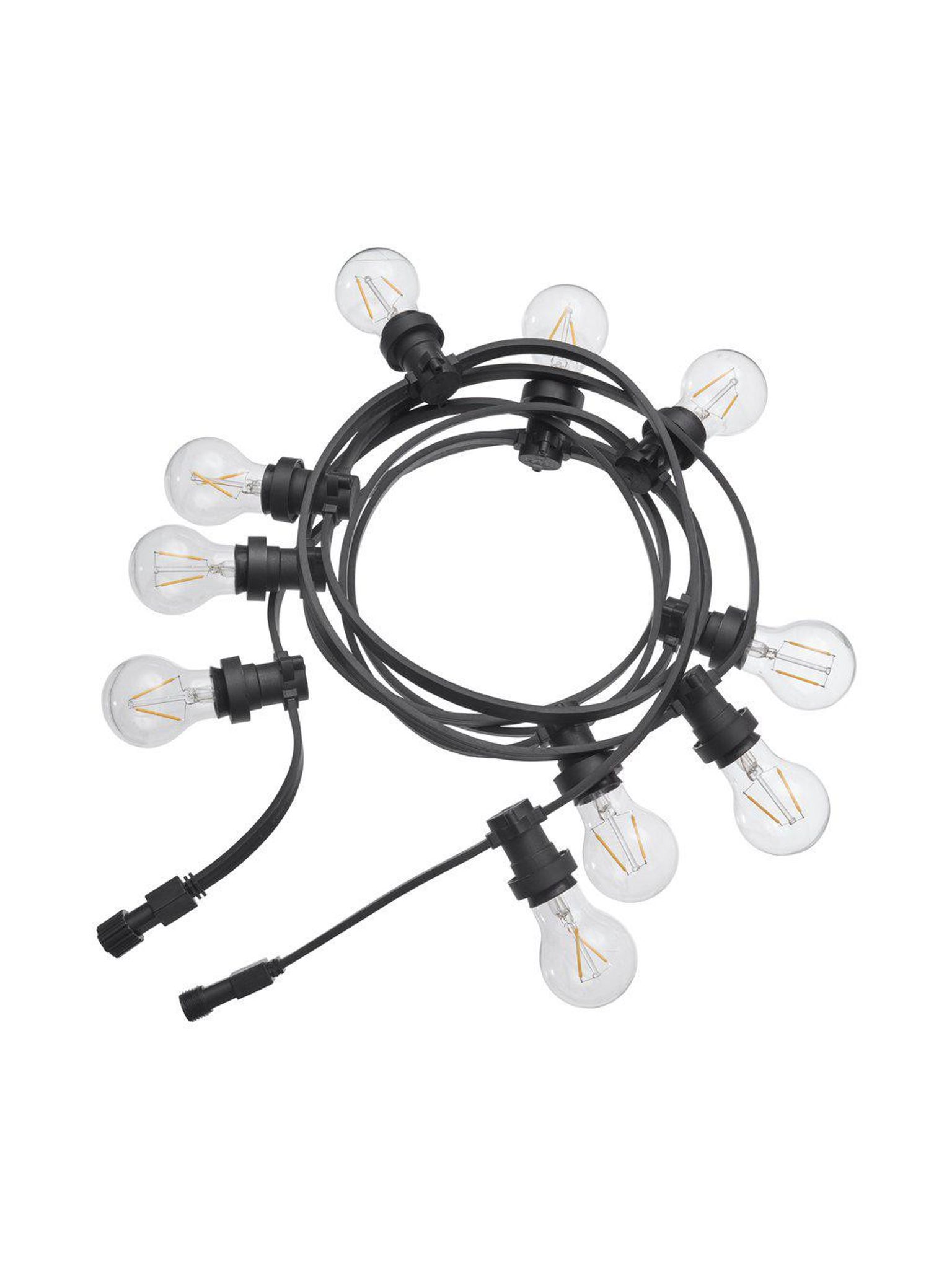 Utomhusljusslinga 4,9 m med 10 E27 LED-lampor i klar, transparent gummi (IP44). Passar din uteplats och funkar bra som belysning; snygg och praktisk slinga som håller länge.