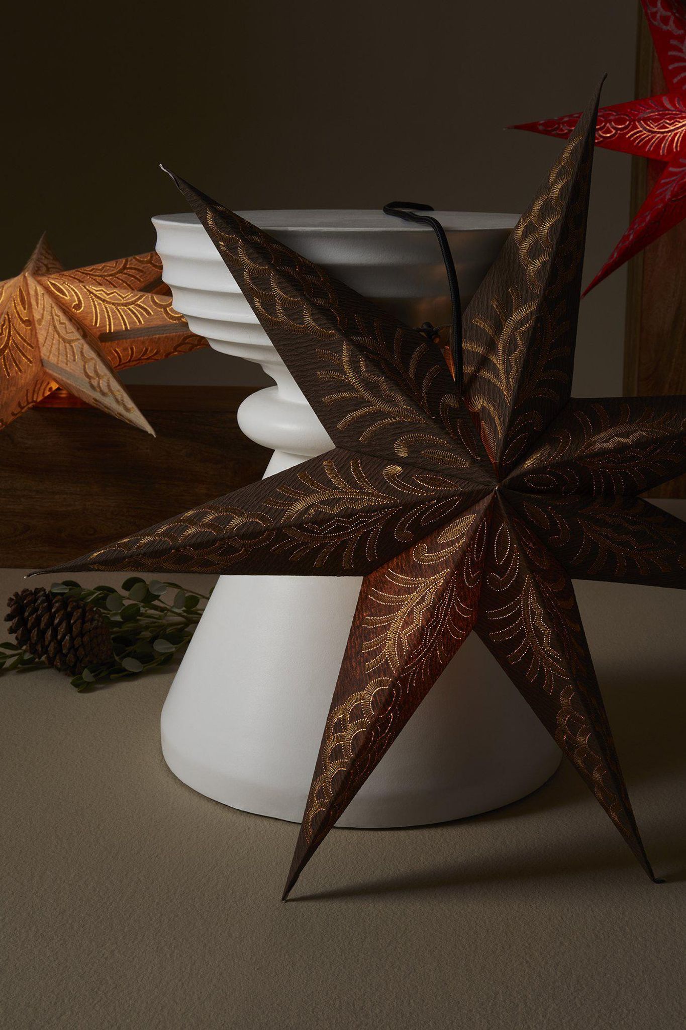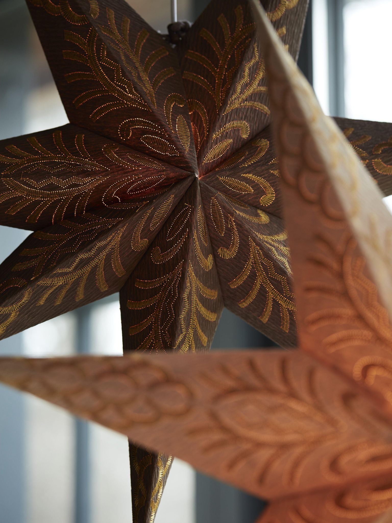 PR Home Celeste Brown Gold stjärna är en pappersstjärna för jul- och vinterdekoration som ger varm stämning i ditt hem. Du kan hänga den i fönster, ovanför en spiselkrans eller använda den som mittpunkt på ett bord — ett enkelt tillskott till din julbelysning och juldekoration.