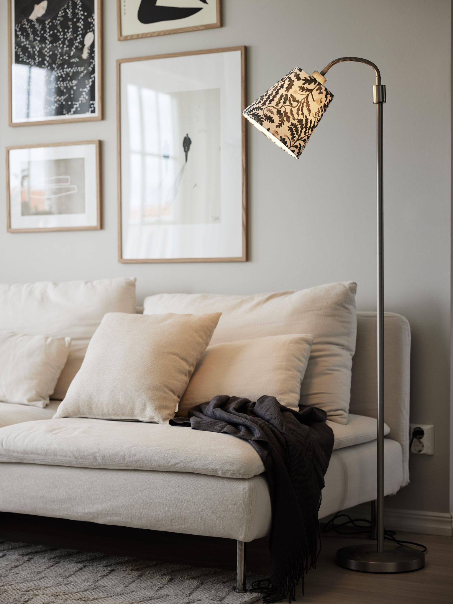 Skärmen är enkel att montera med toppring och är framtagen för lampor med böjd arm. Materialvalet och OEKO-TEX-certifieringen gör att du kan känna dig trygg med textilen.