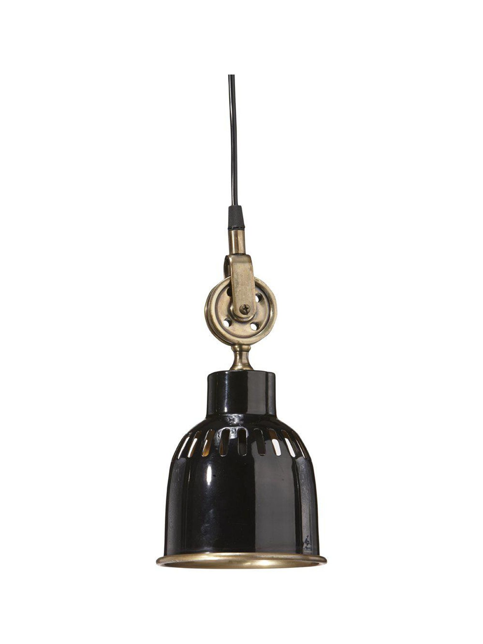 Industriell pendellampa Cleveland i metall, svart/mässing, höjd 23 cm och bredd 14 cm, E27-sockel och 160 cm sladd. Den passar i ditt rum eller vid fönster, funkar bra, är snygg, praktisk och håller länge.