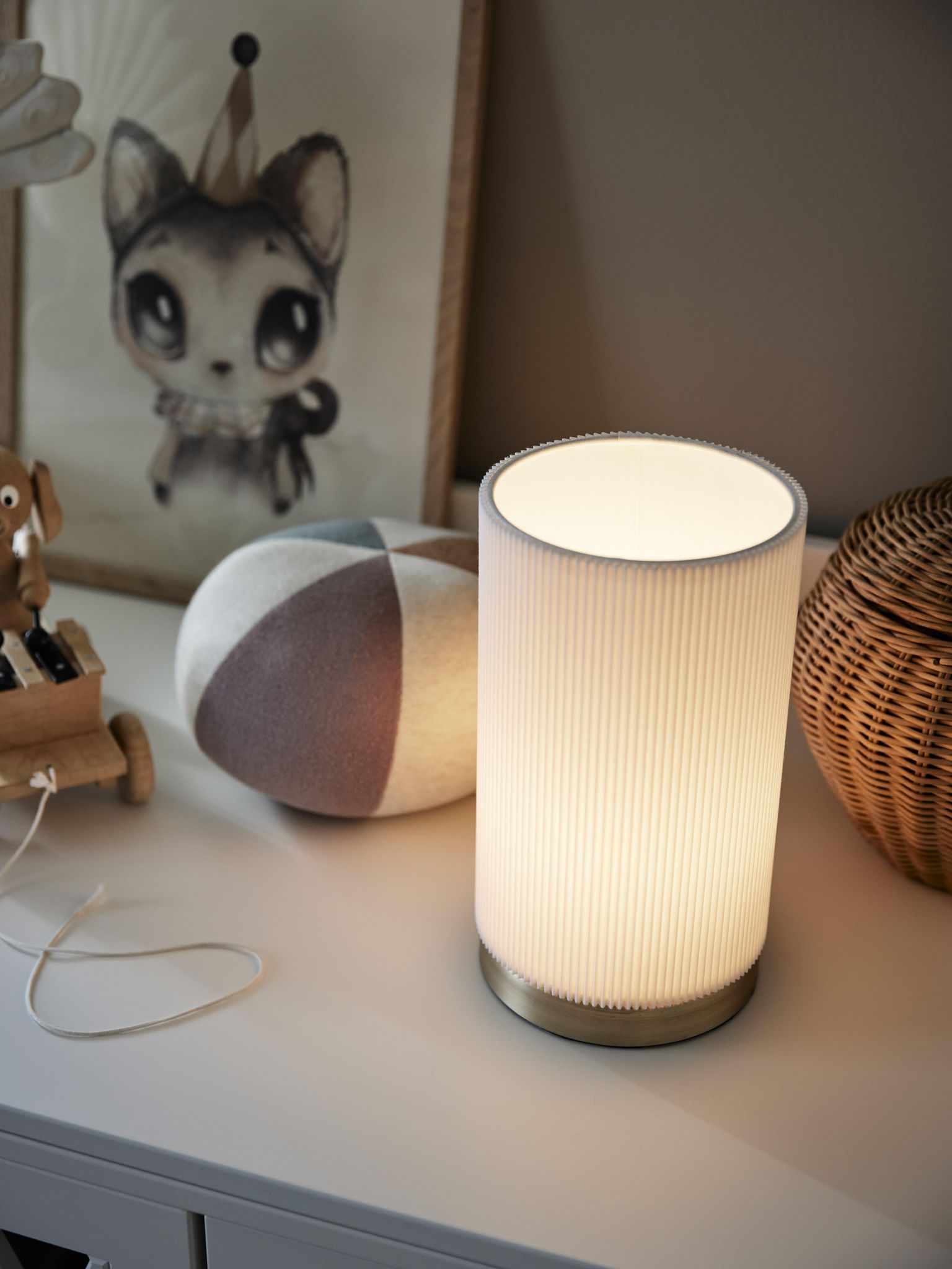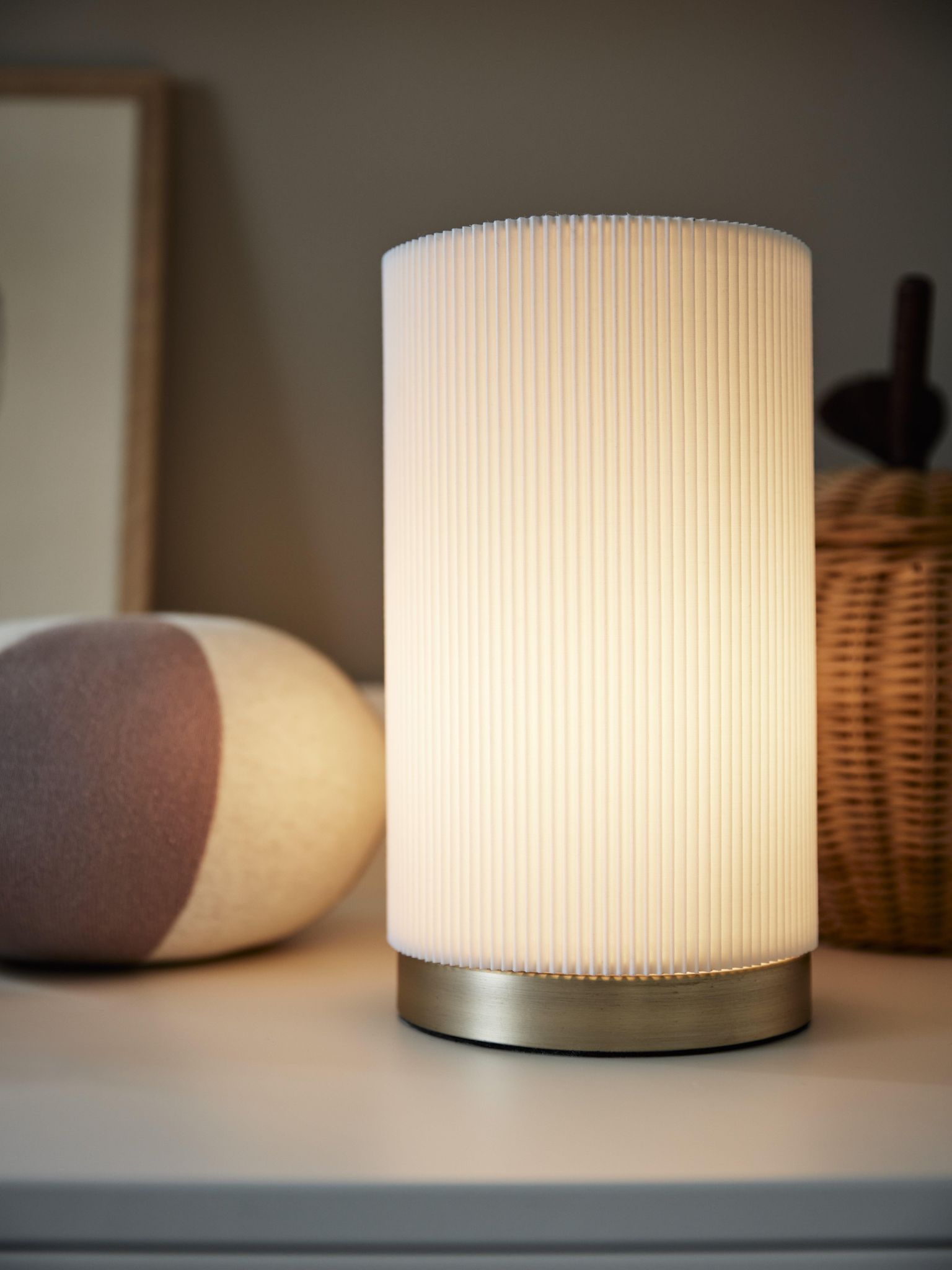 Dora bordslampa sprider ljuset mjukt genom sin veckade skärm och hjälper dig skapa en behaglig stämning vid sängen eller arbetsplatsen. Mattguldytan på basen fungerar fint ihop med olika material och färger i din inredning, vilket gör lampan lätt att flytta runt efter behov.