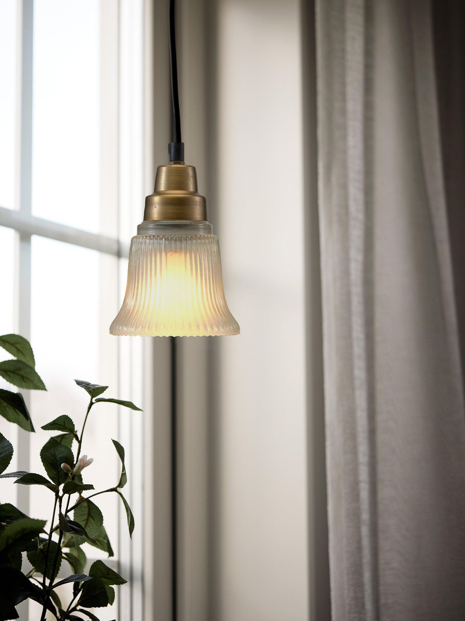 Emmi pendellampa 12 cm i metall med antikmässing och ribbat glas, guldig. Passar i fönster eller över små ytor där din belysning behöver en snygg, praktisk lampa som håller länge.