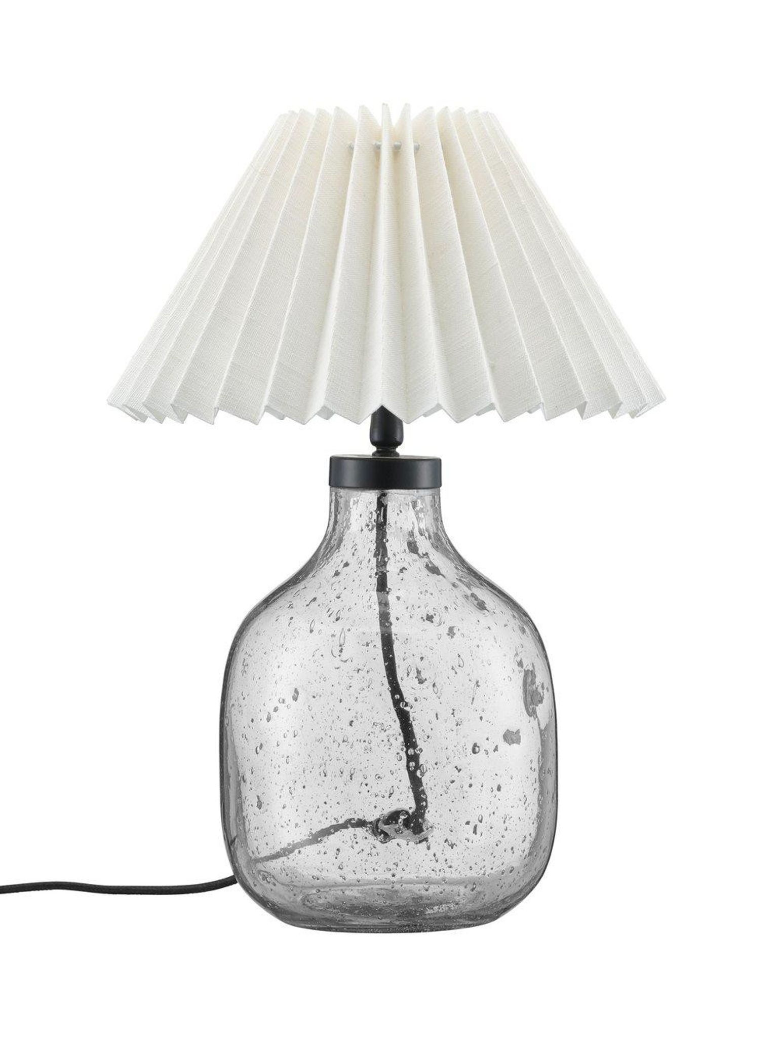 Handgjord Groove bordlampa 38×25 cm i klart ofärgat glas med bubblor och Ines lampskärm, E27, max 40W. Den är snygg, praktisk och håller länge; passar i ditt hem och funkar bra.