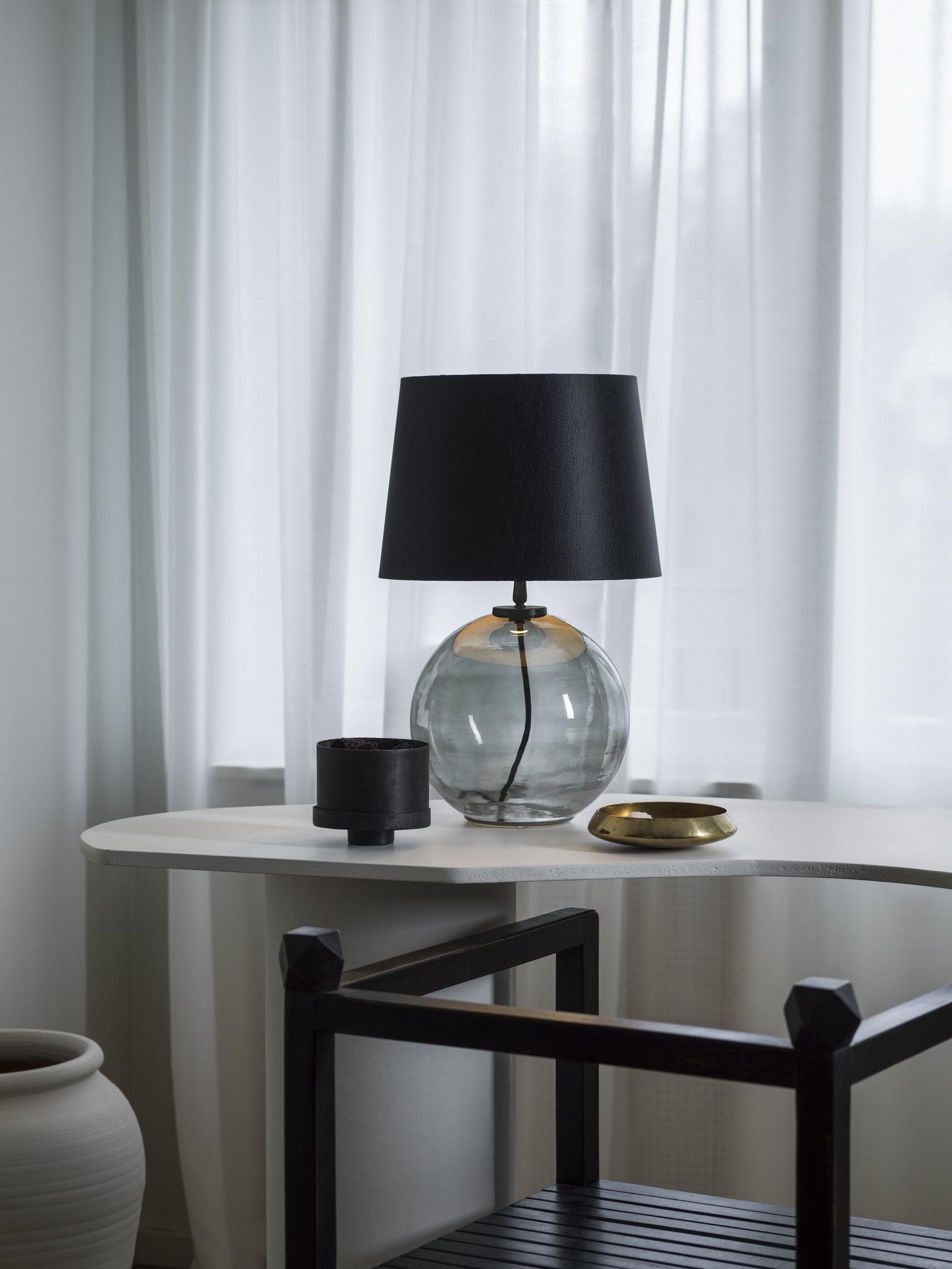 Den justerbara lamphållaren gör det enkelt för dig att hitta rätt ljusnivå — varva mellan mysbelysning för läsning och stjärnakare ljus för uppgifter. Rökfärgat glas ger en genomtänkt, modern känsla och fungerar som en diskret blickpunkt i rummet.