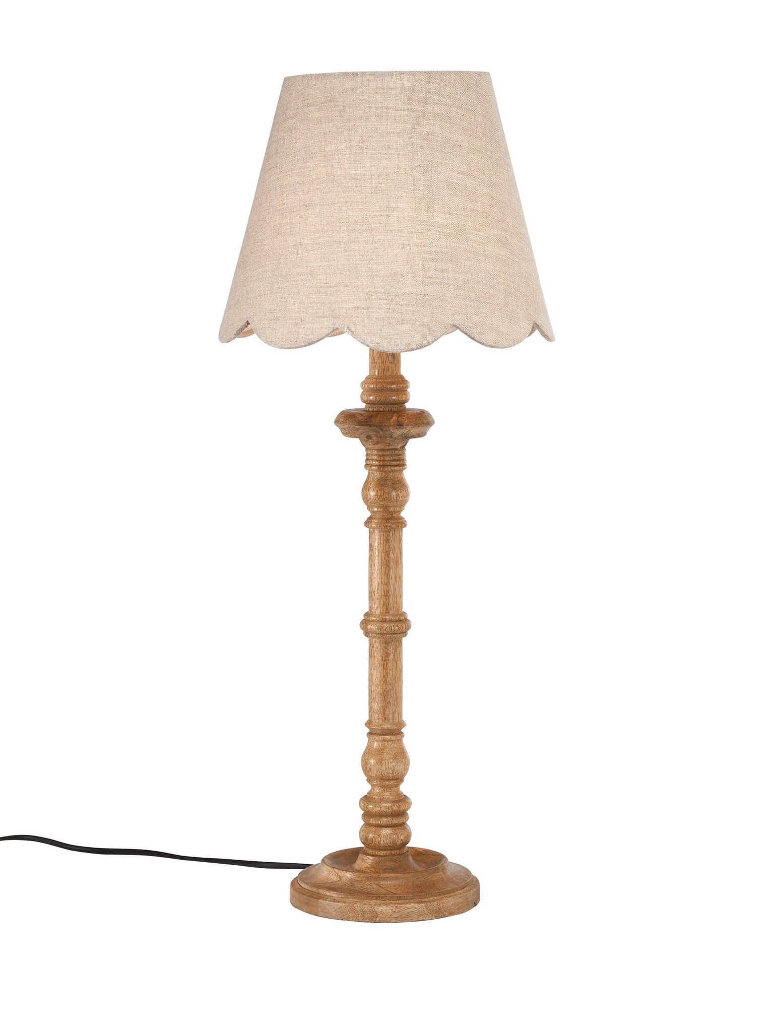 Denna dekorativa beige bordslampa har en form inspirerad av vintage-ljusstakar. Med naturträfinish och en skärm i linne ger den varm och inbjudande stämning — passande som bordslampa i vardagsrummet, som sängbordslampa eller i en läshörna.