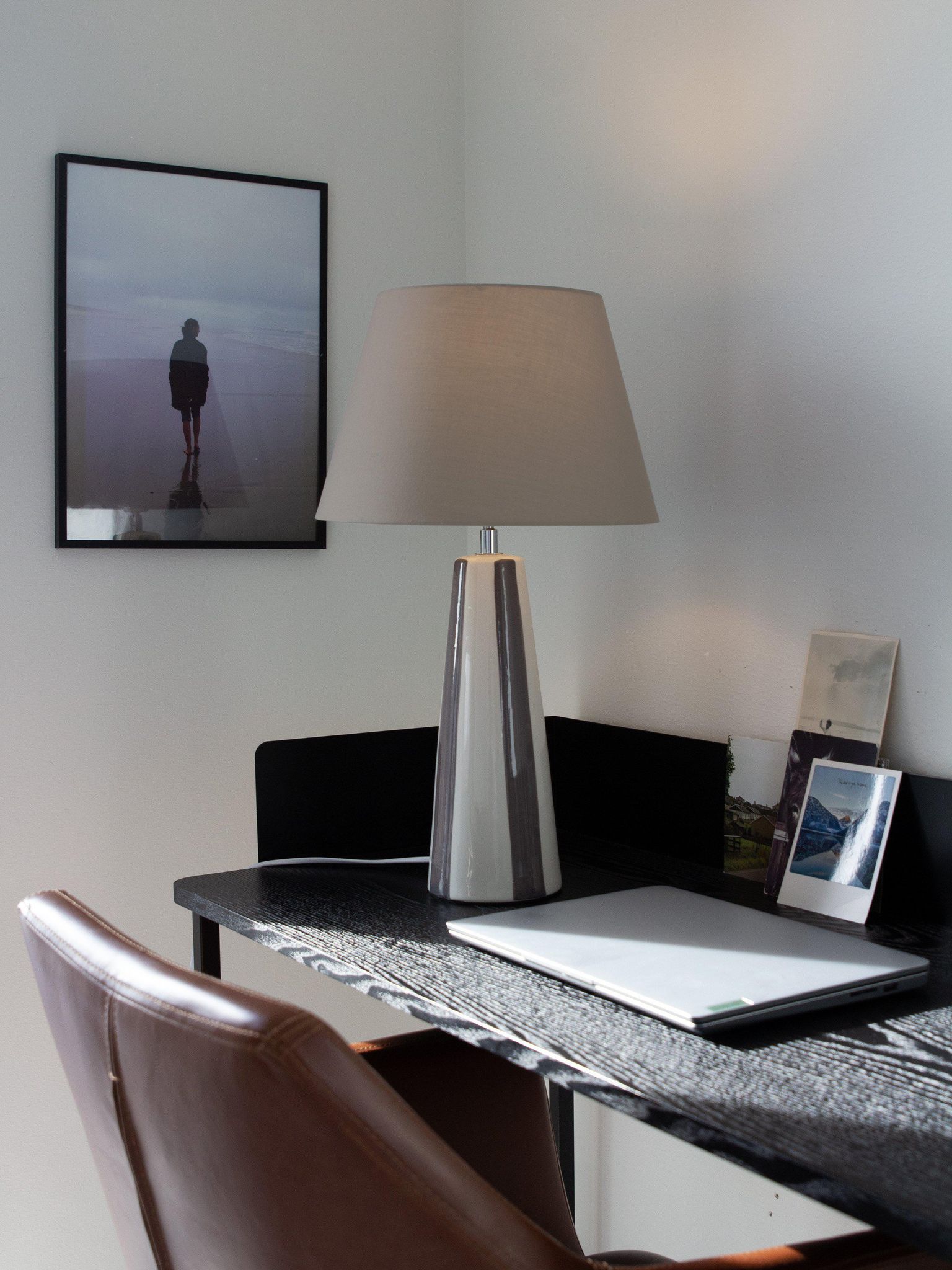 Lampan kombinerar form och funktion med en randig, handmålad keramikkropp som ger ett personligt uttryck i din inredning. Den är 54 cm hög, vilket gör den lämplig som arbets- eller mysbelysning på bord och nattduksbord.