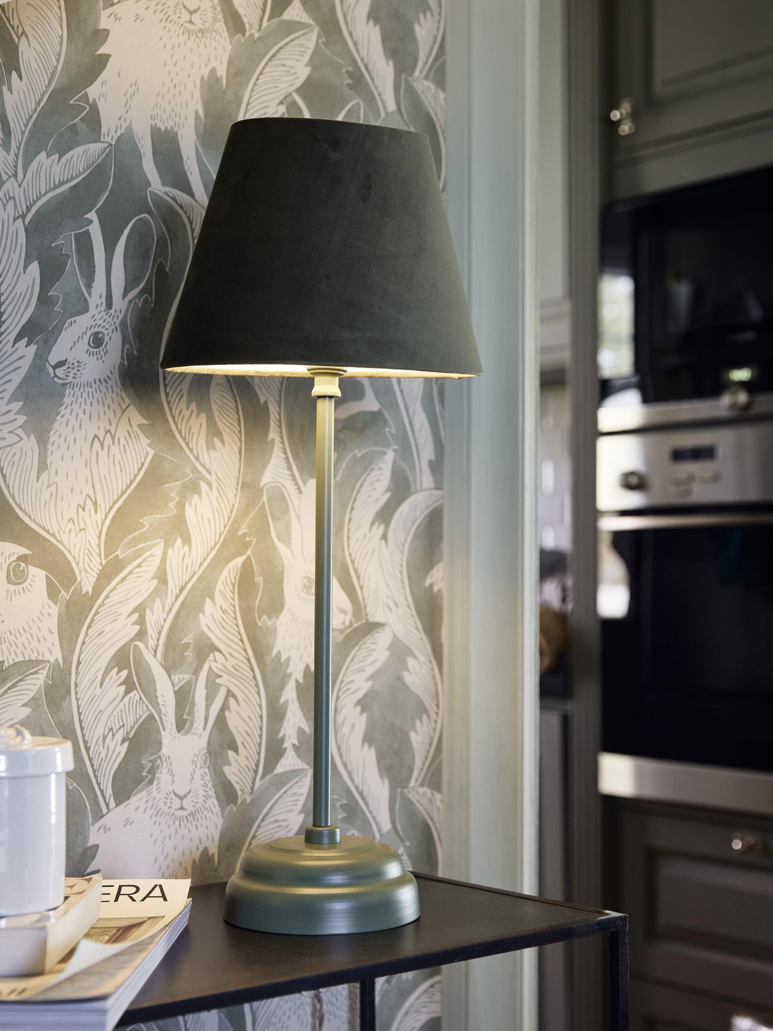 En bordslampa i matt grönt med metallfot och oval skärm i sammet. Lottie bordslampa passar i vardagsrummet, på sängbordet eller skrivbordet när du behöver riktad läs- eller stämningsbelysning.