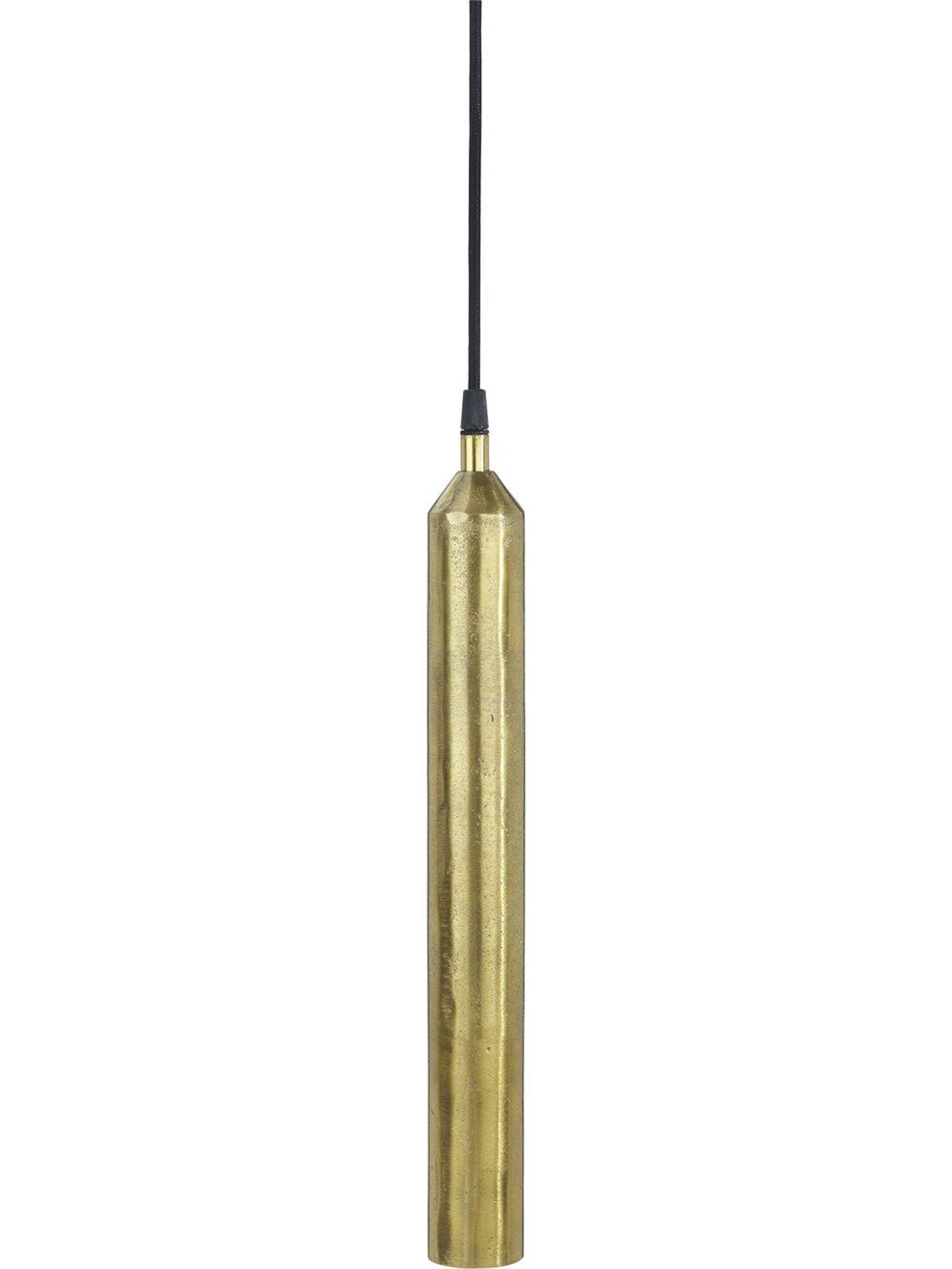 Lampan är tillverkad i metall med rustik guldfinish, höjd 42 cm och bredd/djup 5 cm. Textilsladden är 350 cm lång och sockeln är E27 (max 40W, 230V). Ljuskälla ingår ej. Den kompakta storleken gör den lämplig som liten taklampa eller hänglampa där du vill ha riktat ljus och flexibel placering.