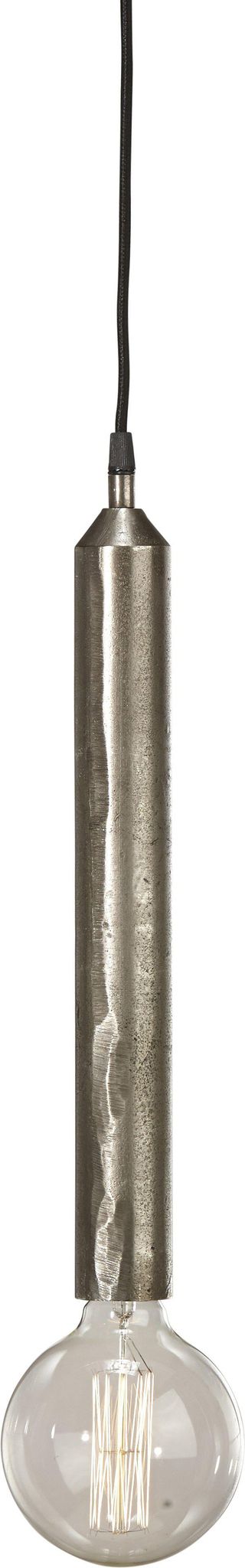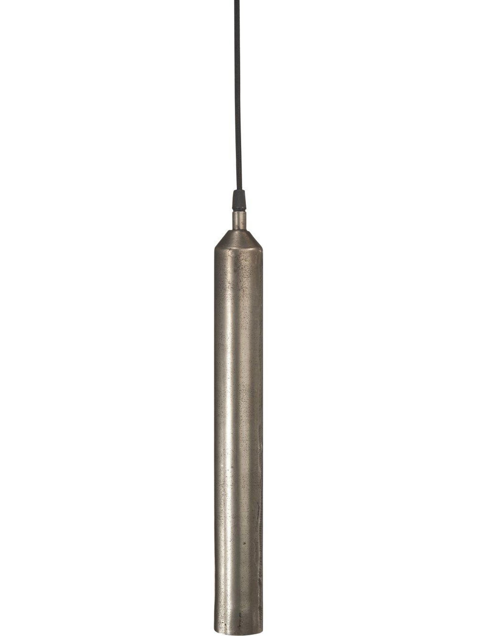 Liten, snygg pendellampa i metall, rustik silver, 42×5 cm med 3,5 m textilkabel. Passar i ditt hem som inomhusbelysning, är praktisk, håller länge och funkar bra som punktbelysning.