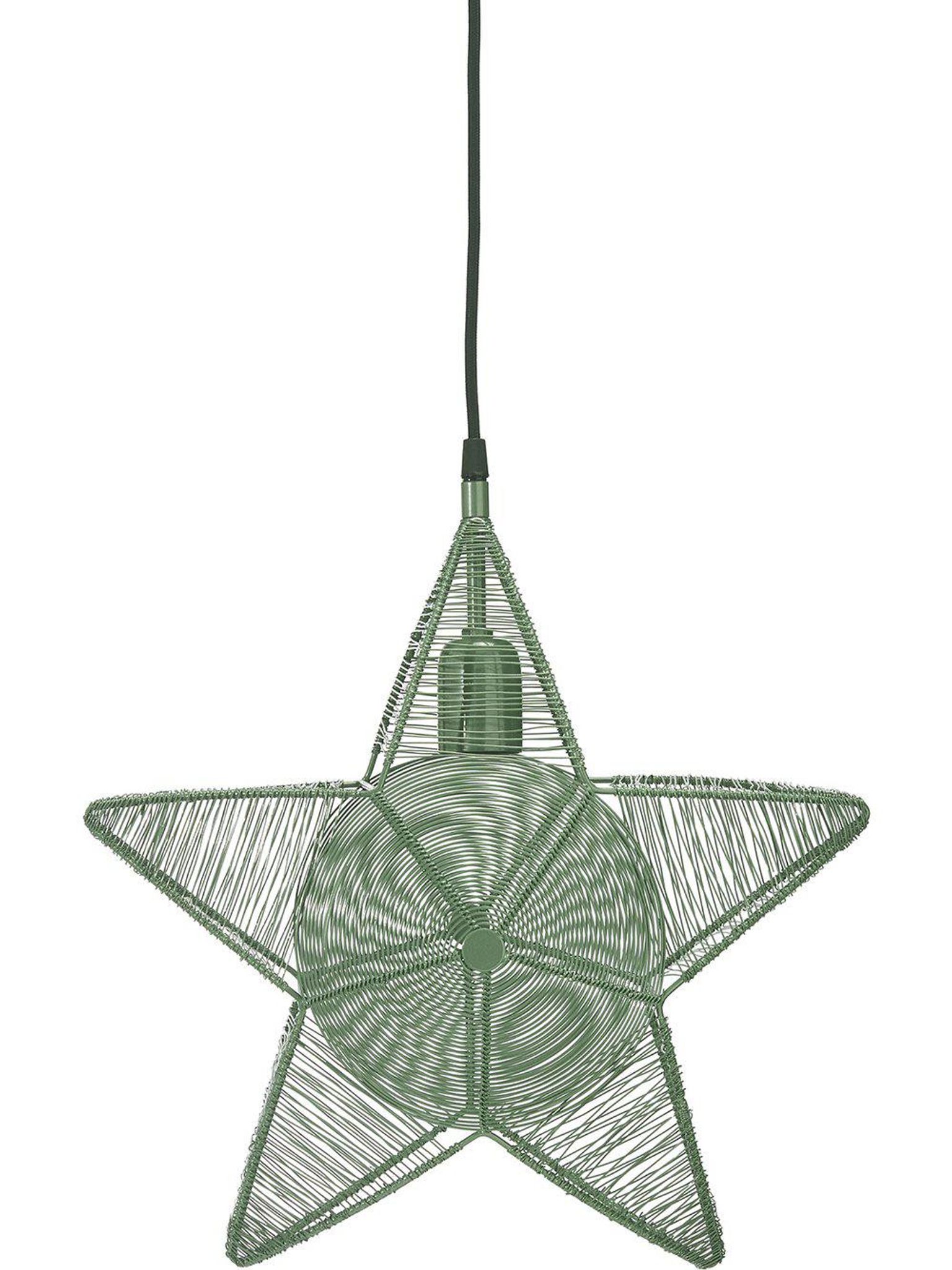 Grön metall hängande stjärna 40 x 40 cm med 3,5 m textilkabel och E27-sockel. Snygg julbelysning som passar i ditt hem, funkar som julstjärna, är praktisk, håller länge och ger bra stämning inomhus.