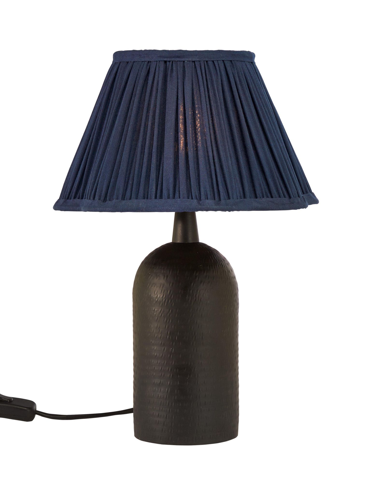 Riley Bordslampa Sonja skärm Midnatt är en svart bordslampa i metall som passar på sängbordet, soffbordet eller i arbetsrummet. Med en hammertone-metallfot och en rynkad tygskärm ger den en mjuk, varm belysning som skapar en behaglig stämning i rummet — bra som läs- eller mysbelysning.
