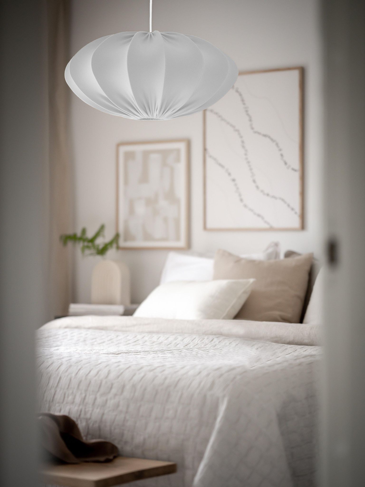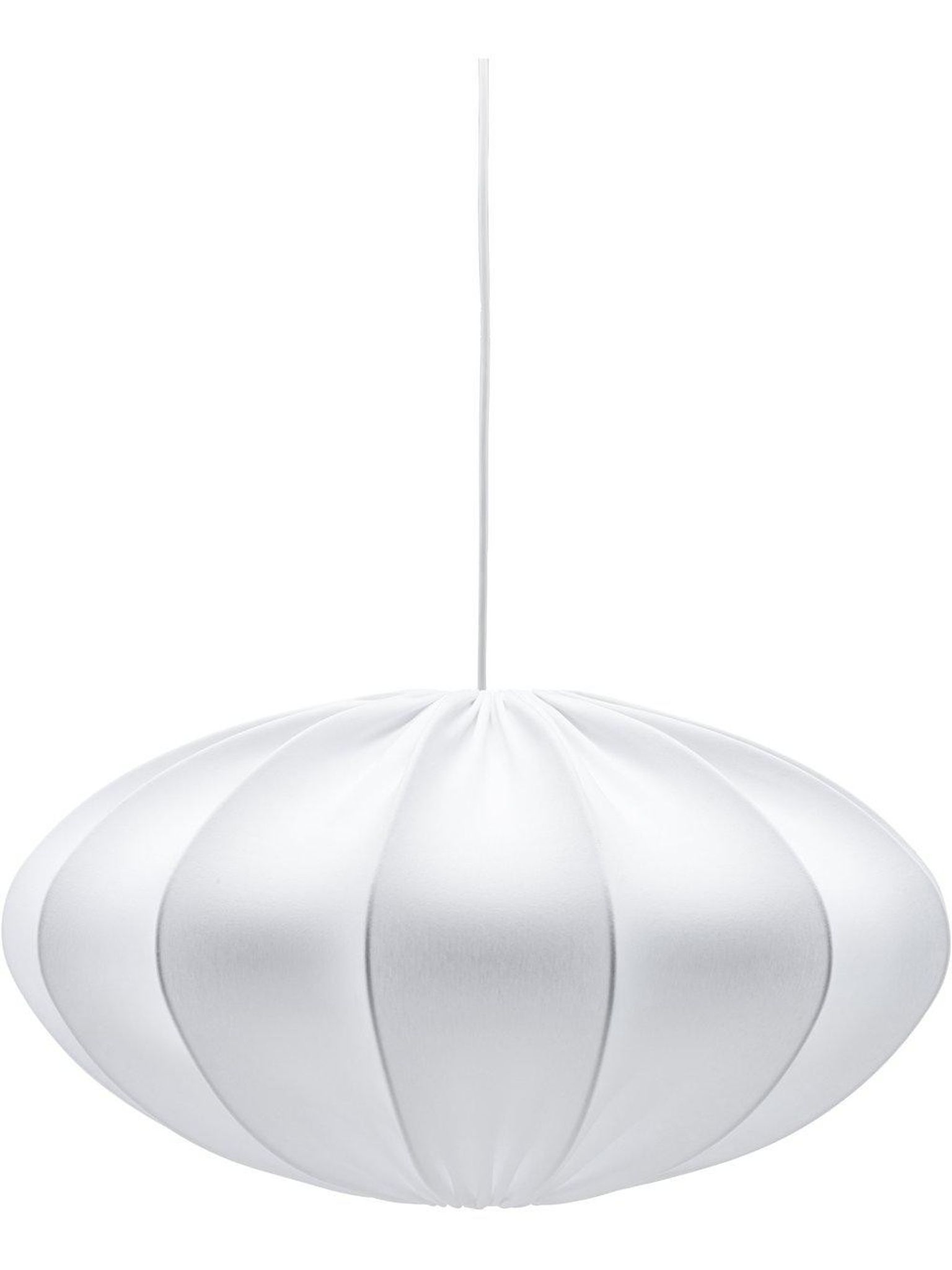 Den genomtänkta formen och det vita jersey-tyget ger ett nedtonat, behagligt ljus som gör det enklare att läsa, äta och umgås hemma. Som pendellampa sprider den ett jämnt ljus över exempelvis matbordet och bidrar till en avslappnad stämning i vardagsrummet.
