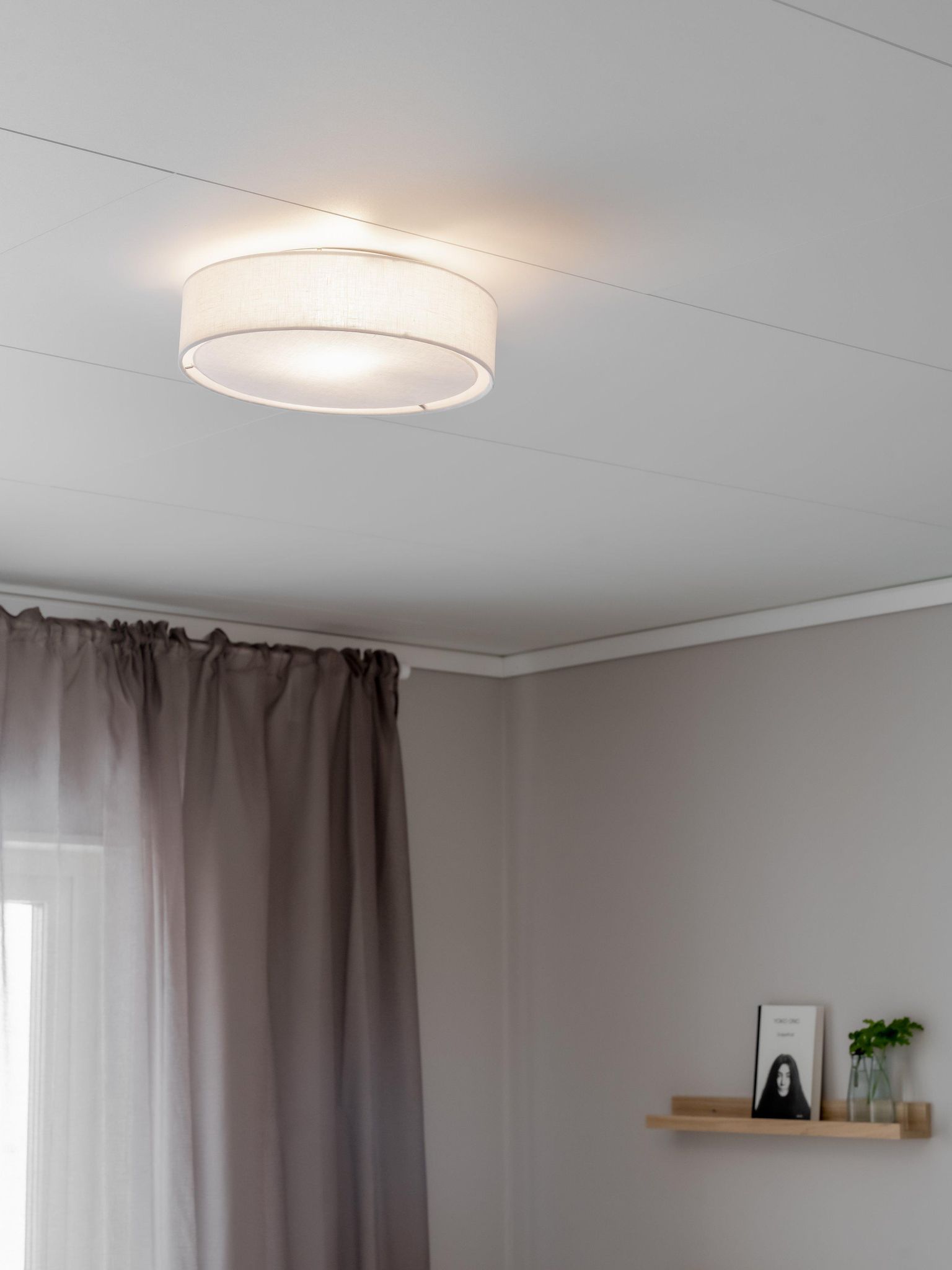 Sam plafond kombinerar metall och linne för en genomtänkt detalj i taket som skapar en varm stämning. Den ger ett mjukt sken som gör rummet mer ombonat och underlättar vardagliga aktiviteter som avkoppling och läsning.