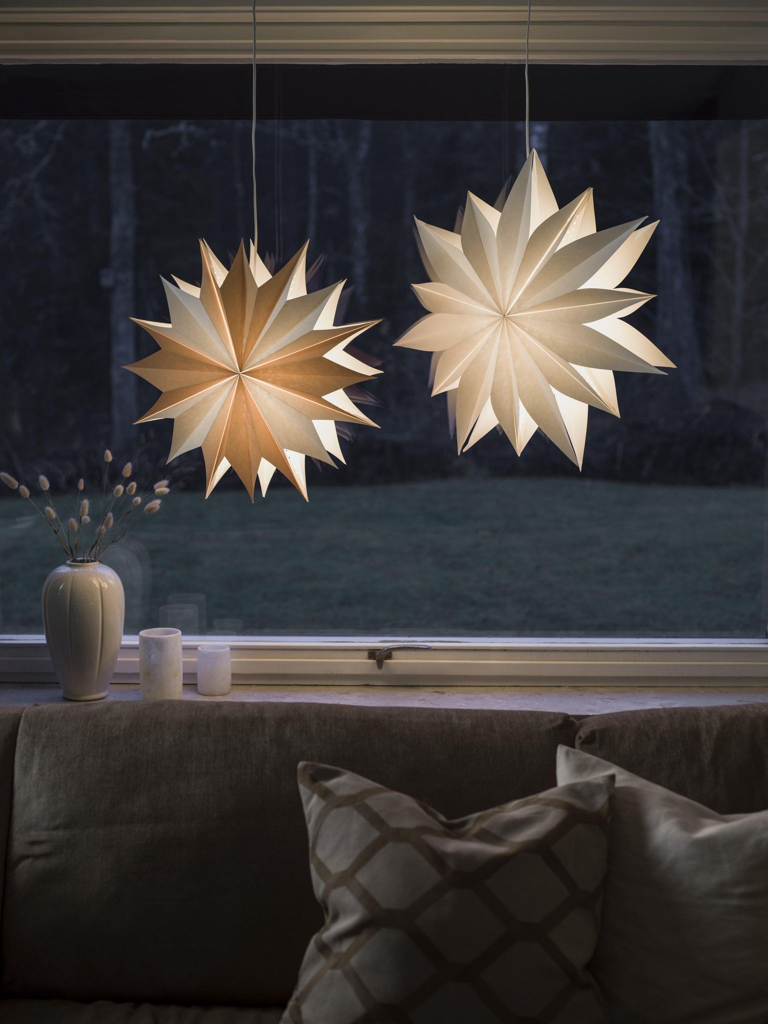 Denna julstjärna i papper ger en mjuk inomhusbelysning som gör vardagsrummet mer ombonat under julen. Tack vare det stansade mönstret får du ett dekorativt ljusskimmer som är praktiskt vid både vardag och fest. Medföljande kardborre och snören gör upphängningen snabb — du sparar tid och slipper verktyg.