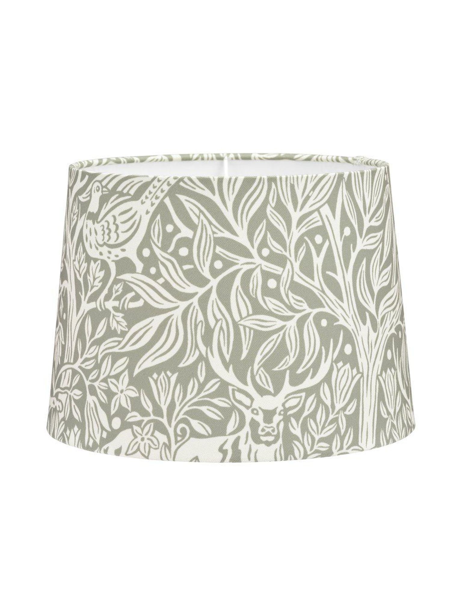 En grågrön lampskärm med mönstret "Under the Elder Tree" från Borås Tapeter. Den ger en naturlig känsla i hemmet och passar bra i vardagsrum, sovrum eller läshörnan där du vill ha ett mjukare, lugnare ljus.