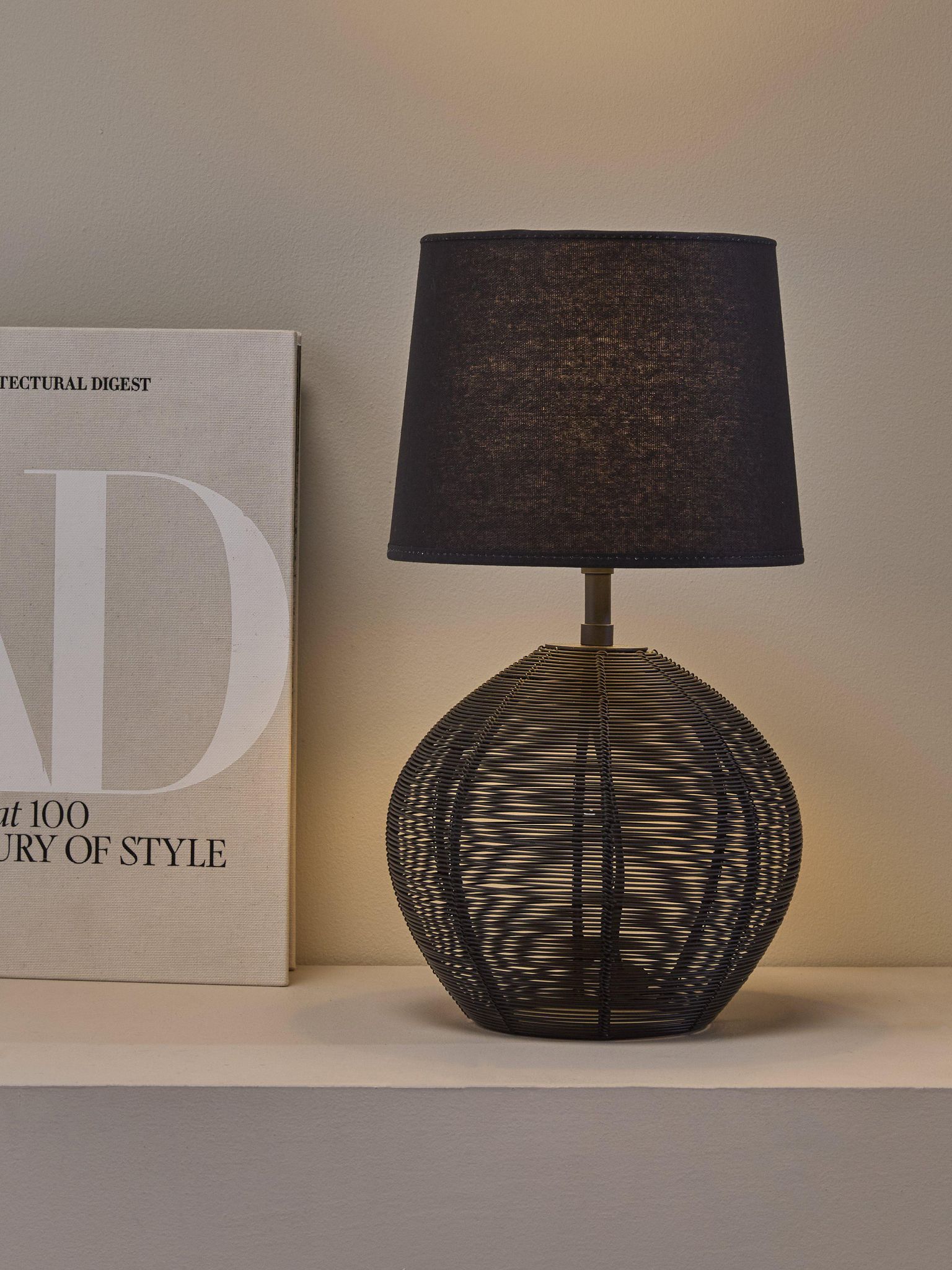 Skärmen har svart utsida och vitt innerfoder som ger ett fint, diffust ljus och en varm stämning i rummet. Den fungerar väl tillsammans med olika inredningsstilar och fungerar både som praktisk ljusspridare och som en diskret dekorativ detalj i rummet.