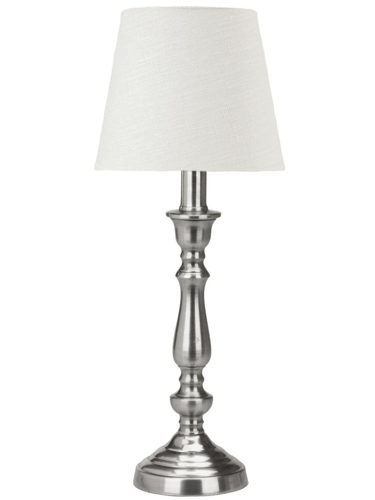 Therese bordslampa med offwhite linneskärm och antiksilverfot är en bordslampa som passar på sängbord, sidobord eller i vardagsrummet. Den håller länge i både moderna och klassiska inredningar och ger ett mjukt, inbjudande sken som gör rummet mer ombonat — bra som läsbelysning eller stämningsljus.