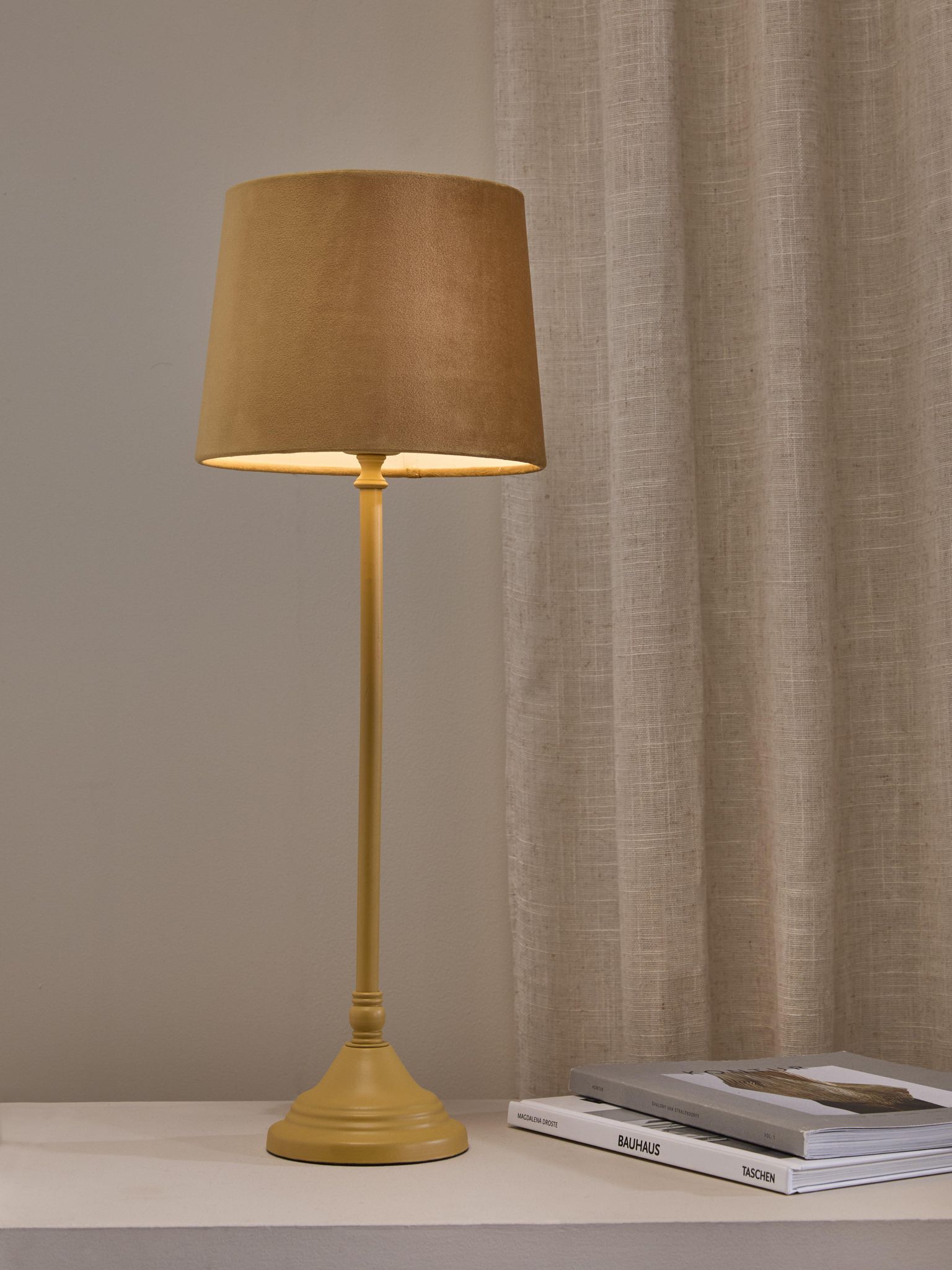 Bordslampa Tove i gul sammet är en bordslampa med lampskärm som passar lika bra på ditt sängbord som på skrivbordet. Den ger behagligt ljus för läsning och skapar en ombonad stämning i rummet.