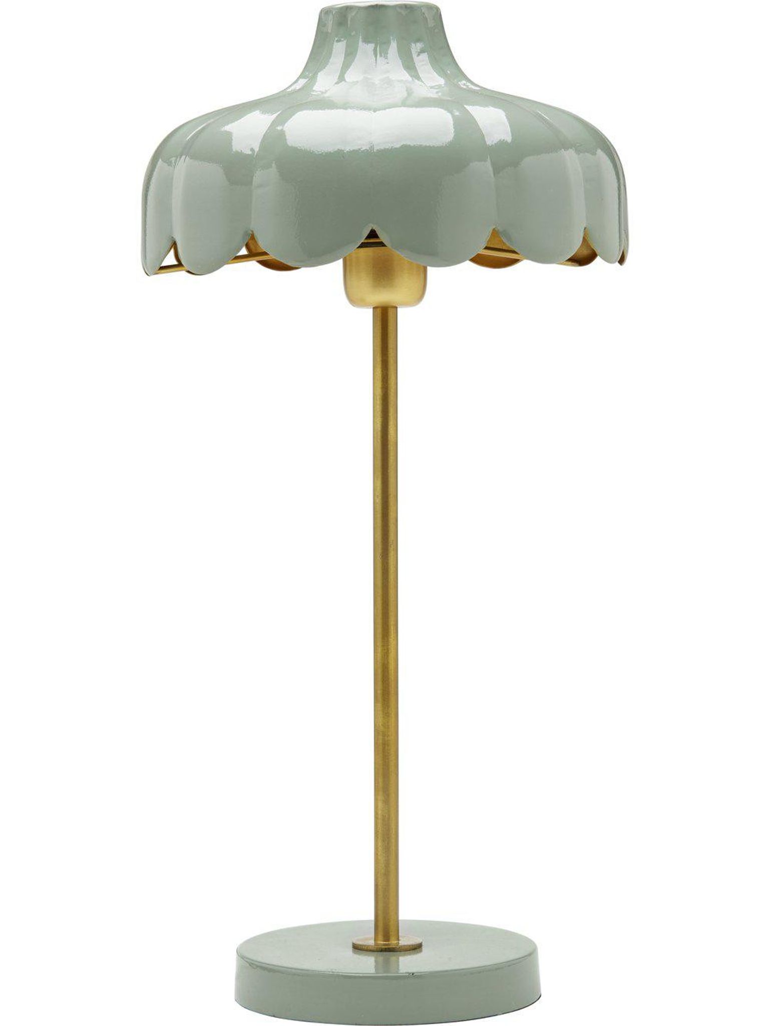 Grön/guld bordslampa Wells är en bordslampa som ger ett varmt, dekorativt ljus och passar bra på sängbordet, soffbordet eller i ett läshörn. Den handgjorda skärmen med blom-inspiration ger en personlig detalj som lyfter din inomhusbelysning och gör rummet mer ombonat.