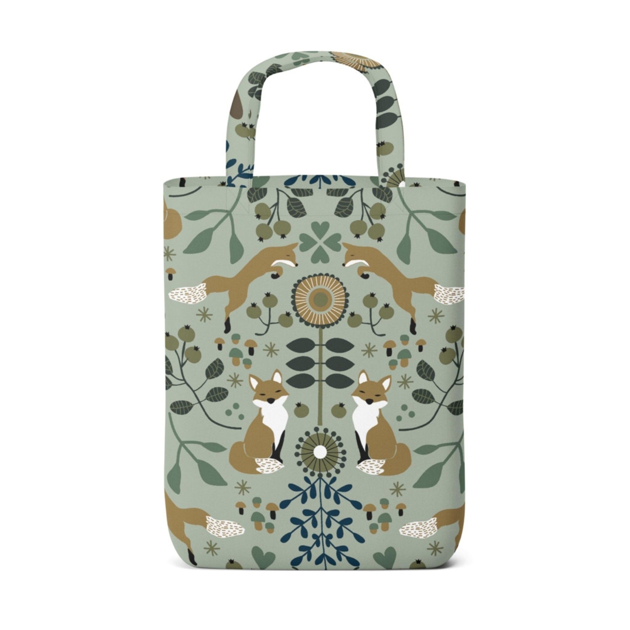 Rävstigen grön kasse från Arvidssons Textil är en hållbar och stilren tygkasse i 100% bomull, prydd med ett lekfullt räv- och växtmotiv av Linda Svensson Edevint.