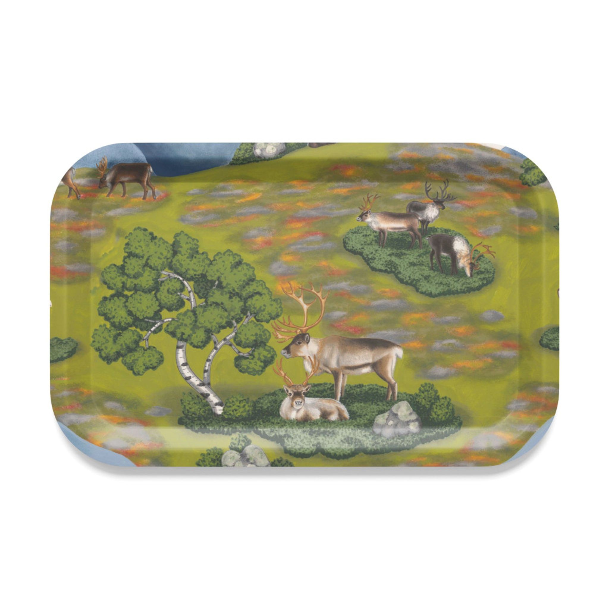 Renvandring grön bricka – en stilren inredningsdetalj från Arvidssons Textil. Tillverkad i björkfanér med ett lekfullt renmotiv i gröna nyanser, perfekt för vardagsservering eller som dekor på bord och sideboard. Designad av Mialotta Arvidsson Mars och väl lämpad för det nordiska köket och soffbordet.