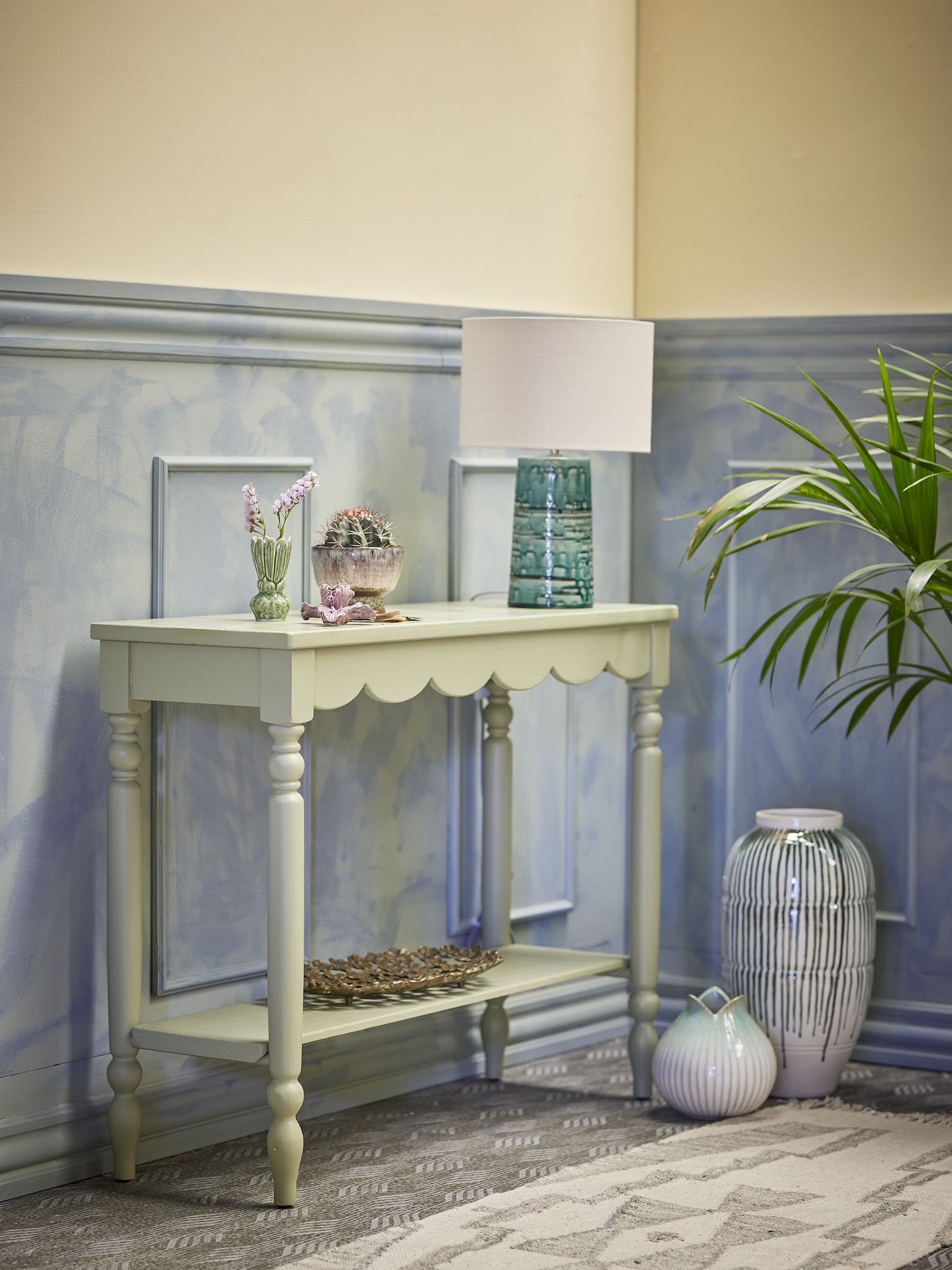 Salla Konsolbord Grön Tall från Bloomingville Creative – stilrent tallbord som lyfter hallen i hemmet. Grön färg och scallop-kant ger varmt, tidlöst uttryck.