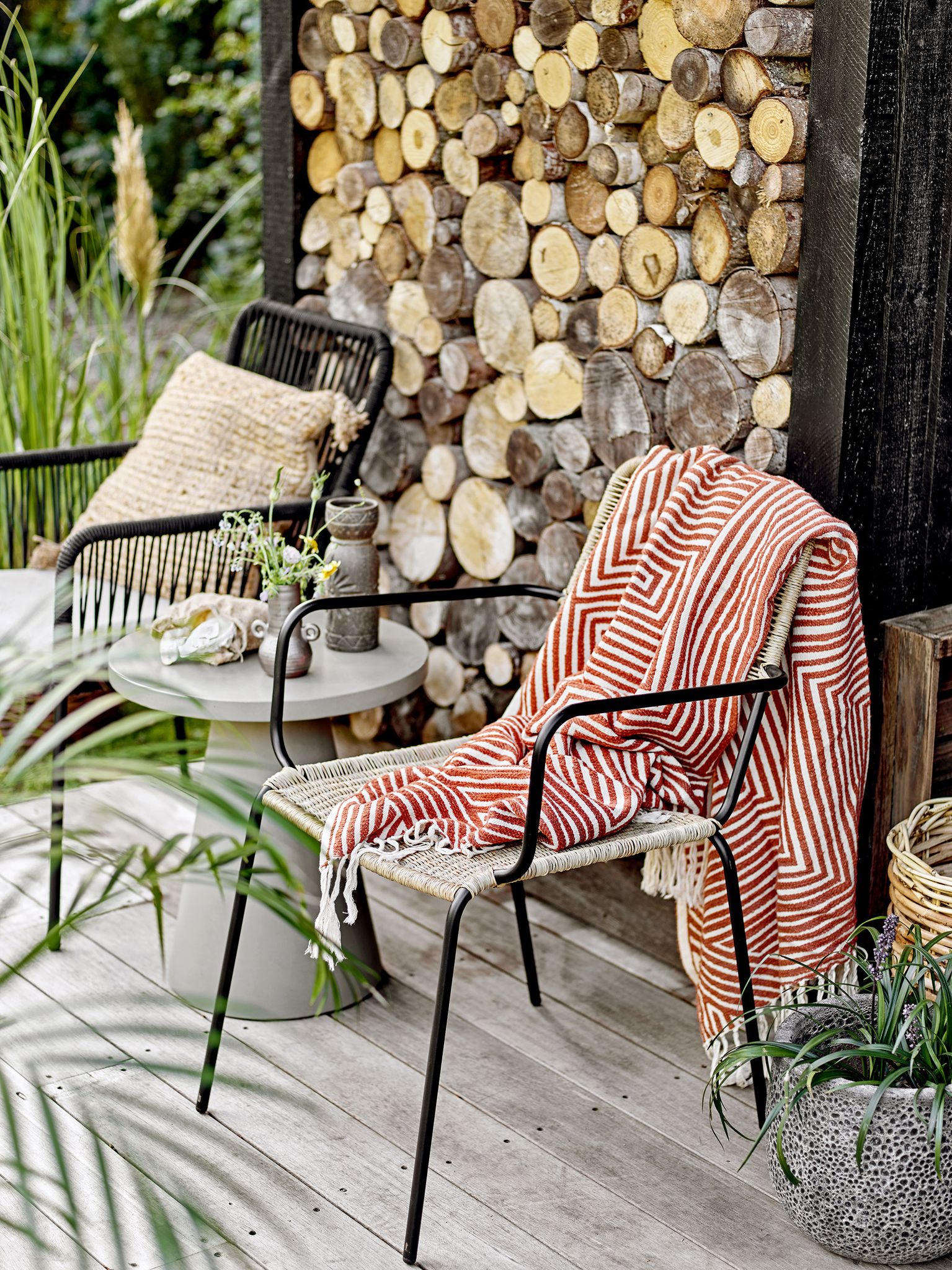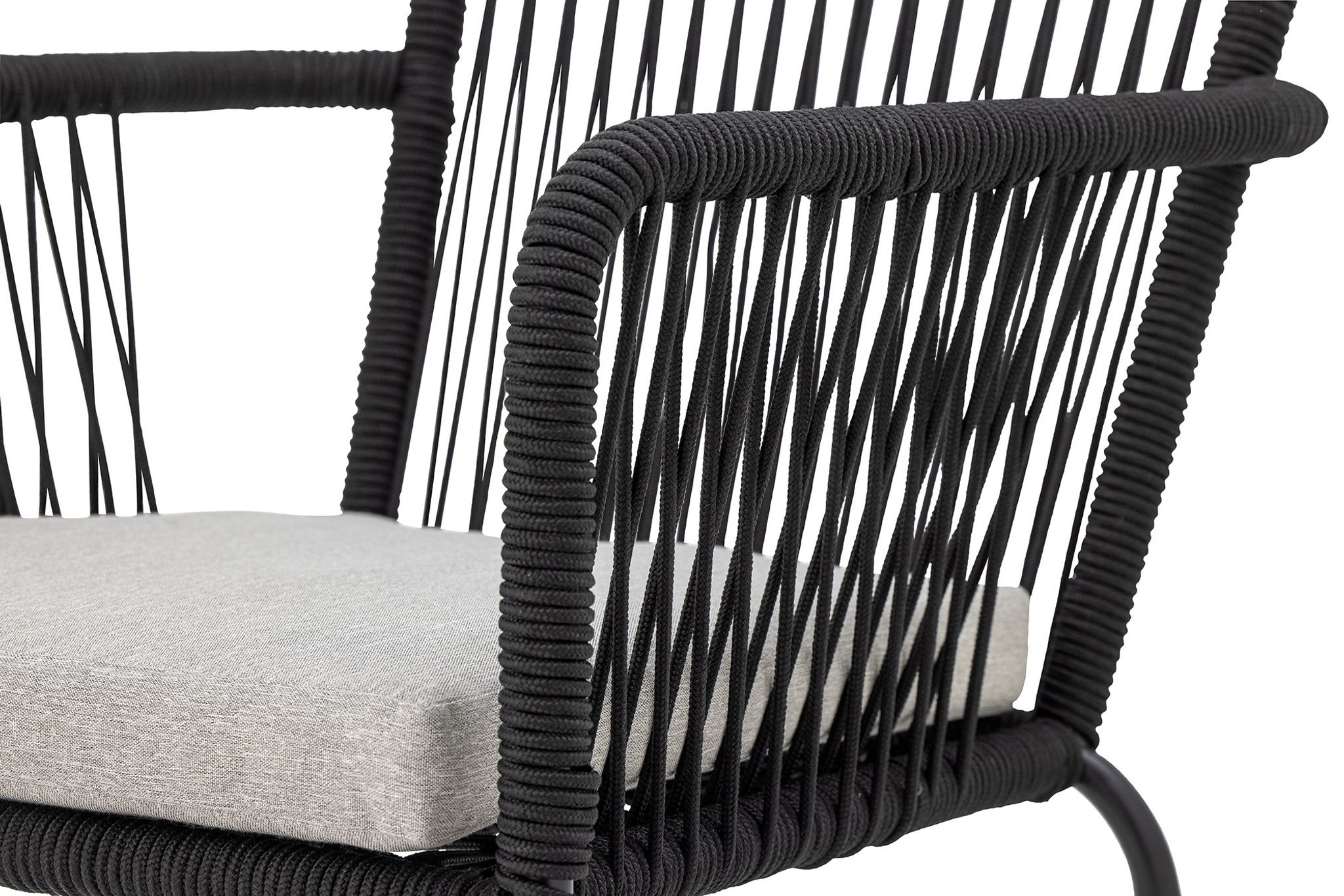 Stolens frost-säkra ram förlänger användningen utomhus och gör att du kan njuta av din utemöbel längre under säsongen. Den vattenavvisande dynan håller dig torr vid oväntat regn så att middagen eller fikastunden inte behöver avbrytas. Det handvävda repet bidrar till hållbarhet och ser till att färgerna står emot solljus bättre.