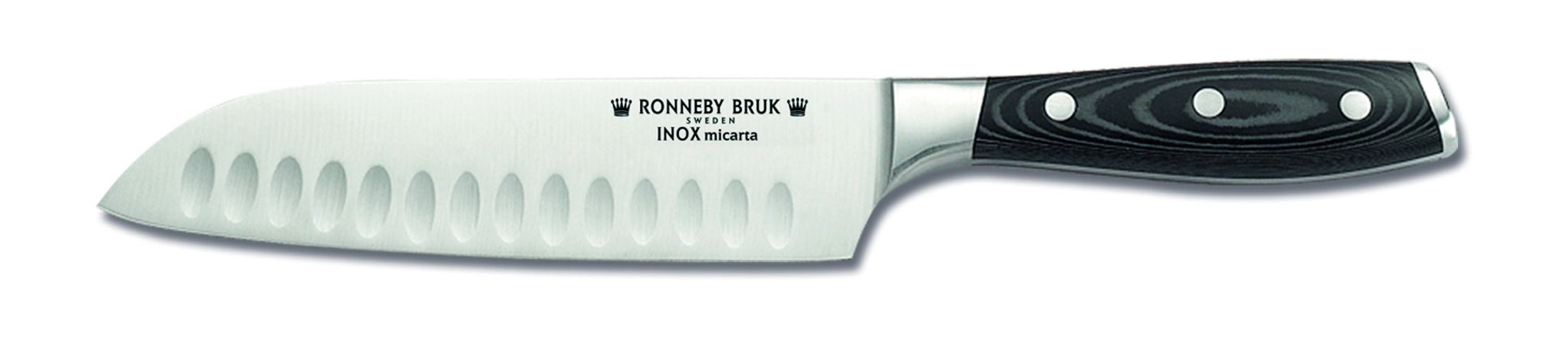 Upptäck den eleganta Santoku-kockkniven från Ronneby Bruk. Med 17,5 cm klinga och ergonomiskt micartaskaft, förenar den hållbarhet och stil.