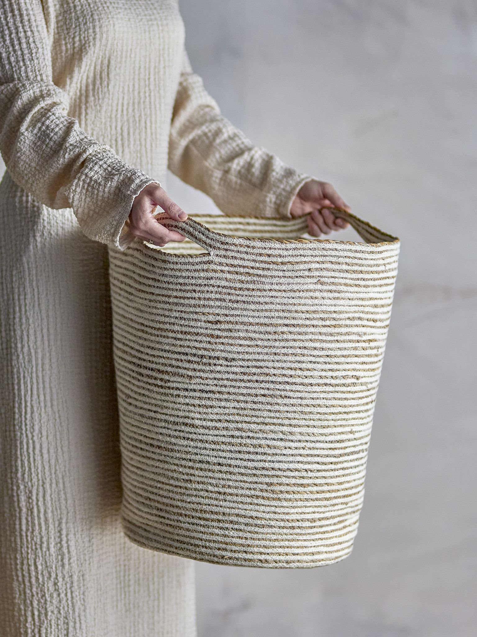 Den handgjorda Selena-korgen kombinerar funktion och enkel form. Storleken (49 cm hög) ger gott om plats för dina saker och gör det lättare att hålla hemmet organiserat utan att det känns rörigt. Designen tillför också textur och värme till rummet.