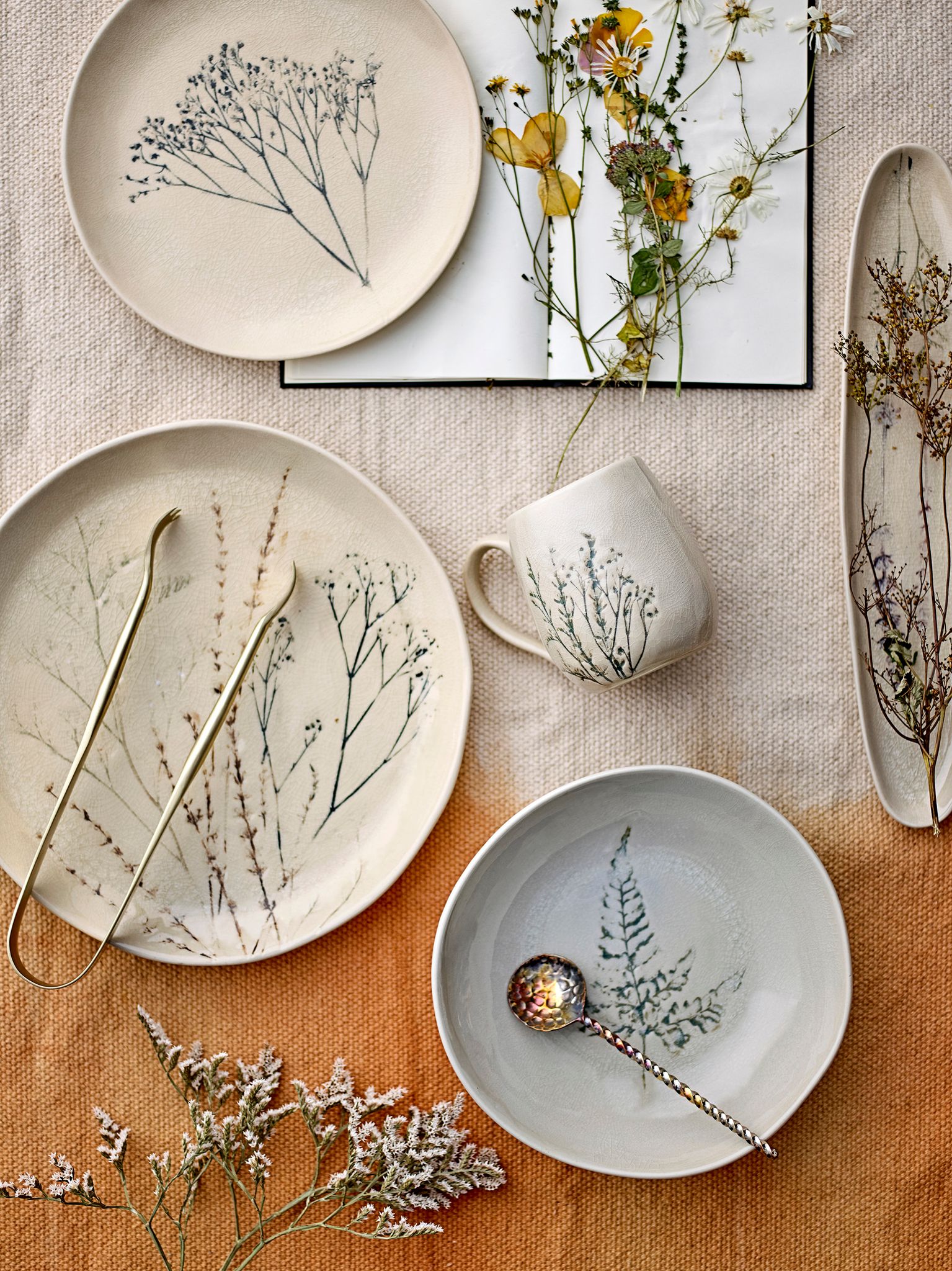 Det här serveringssetet kombinerar praktisk funktion med en genomtänkt, handgjord känsla. Du får tallrikar och skålar som fungerar lika bra till frukost, vardagsmiddag och helgens bjudningar, och som gör det lättare för dig att duka ett enhetligt bord med naturtoner och blomdetaljer.