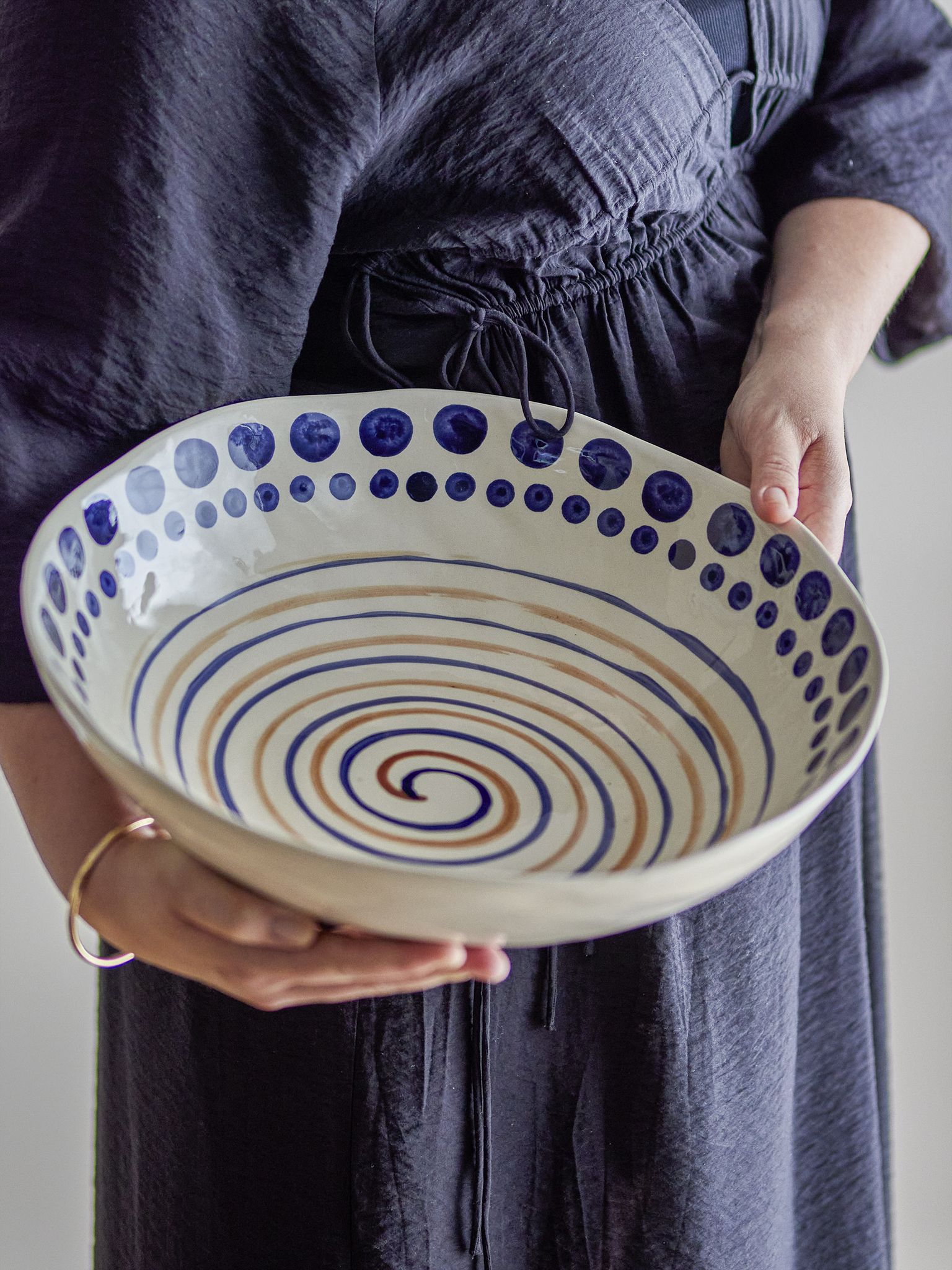 Shama skålen kombinerar funktion och form på ett enkelt sätt. Den generösa storleken gör den flexibel i köket — använd den som salladsskål, serveringsskål eller som en färgstark detalj på bordet. Den handmålade ytan ger en personlig touch till din dukning och gör att varje måltid känns lite mer genomtänkt.