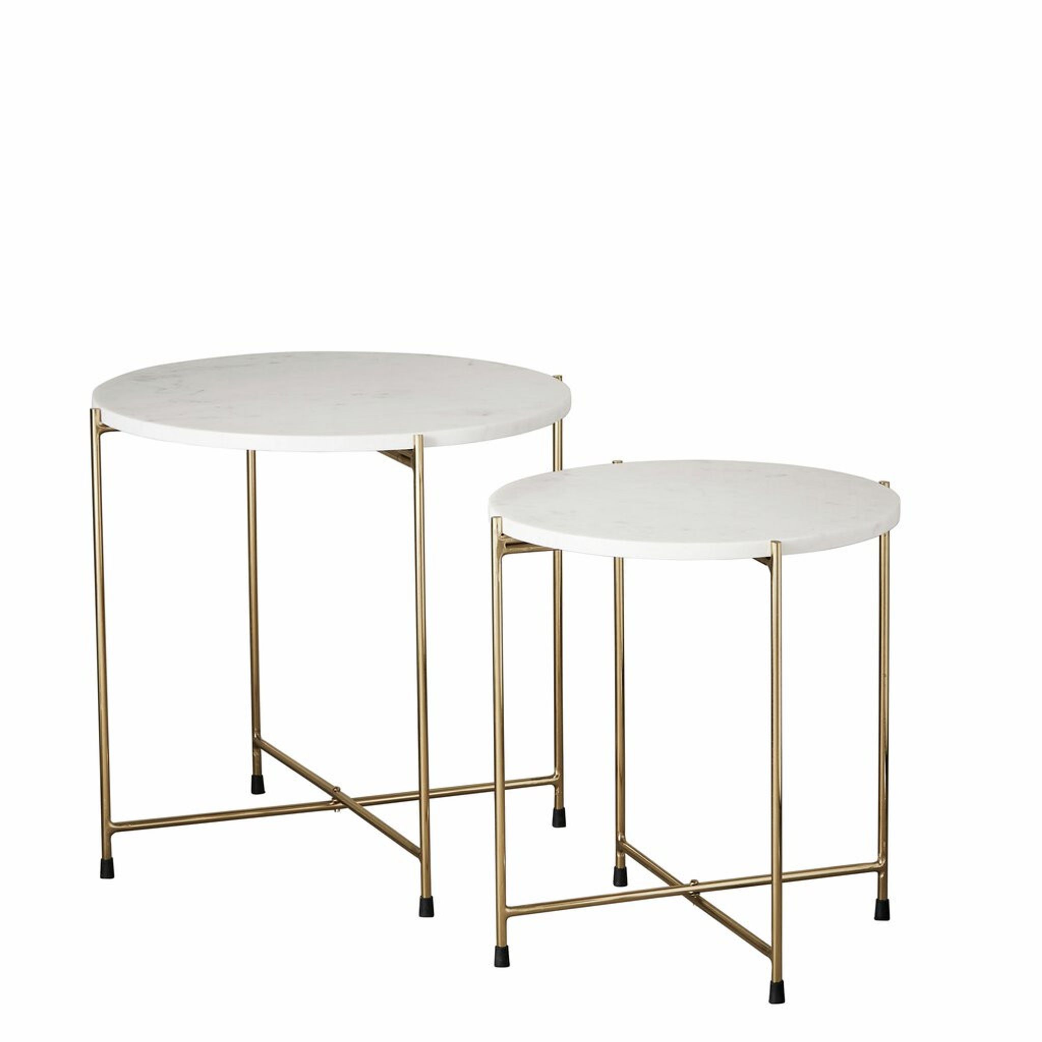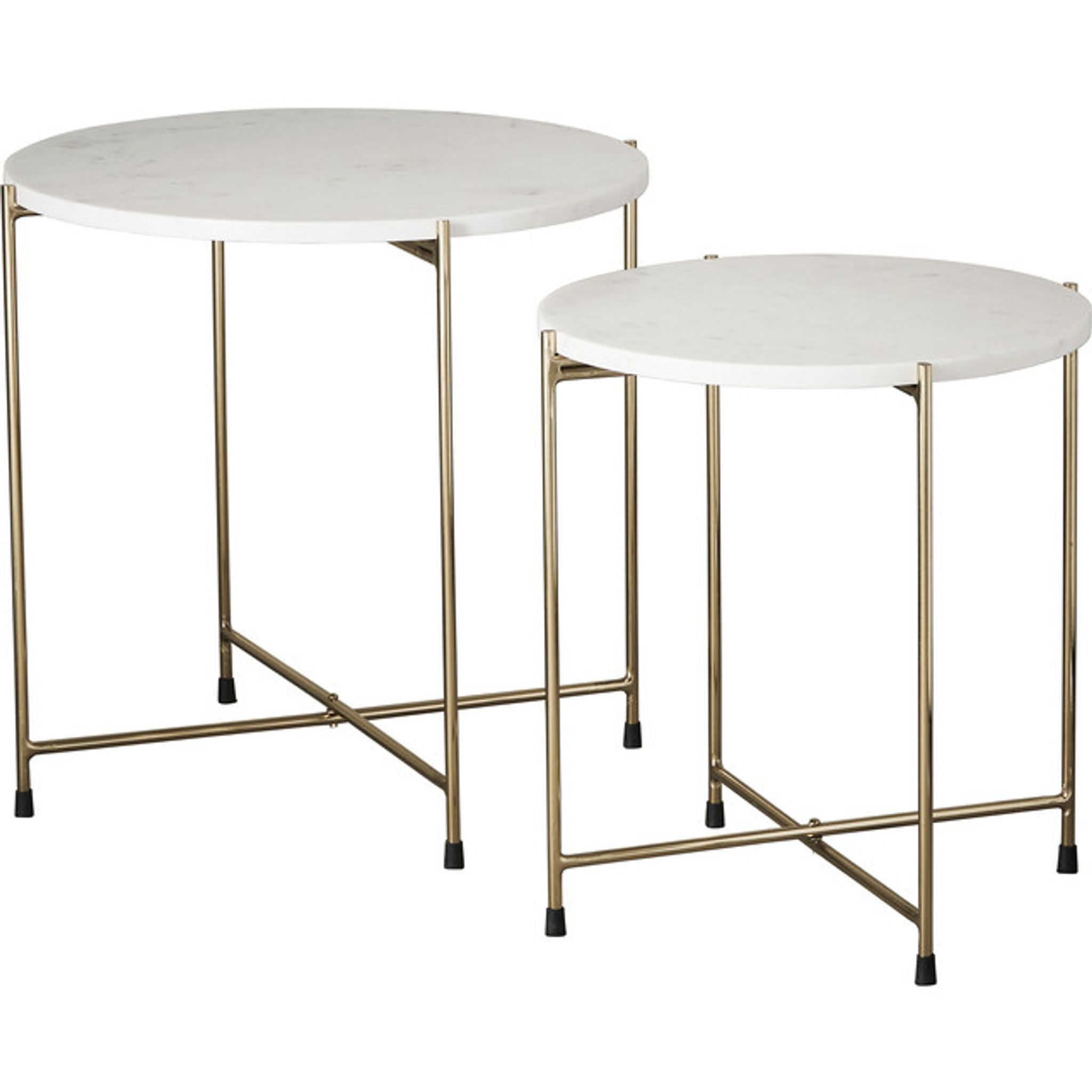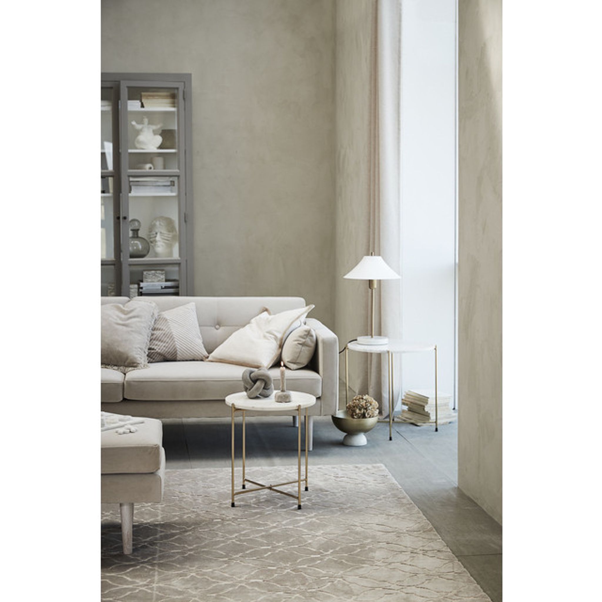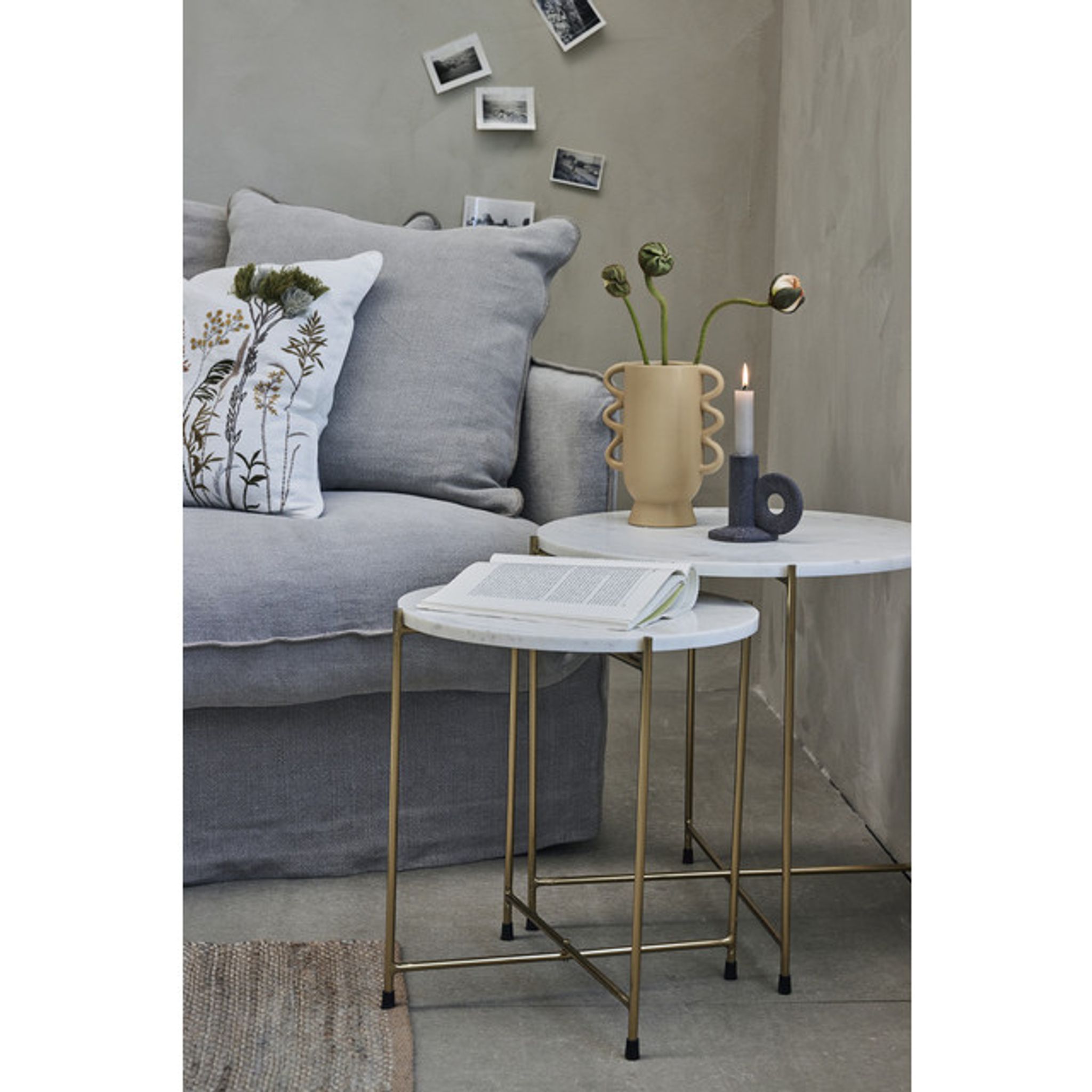 Marmilla sidobordsset från Lene Bjerre är två sidobord i vit marmor/travertin som passar i vardagsrum, sovrum eller intill din favoritfåtölj. De fungerar både som praktiska avlastningsytor och som ett stilfullt inslag i inredningen — ett smart satsbord för vardagsrum eller som sängbord.