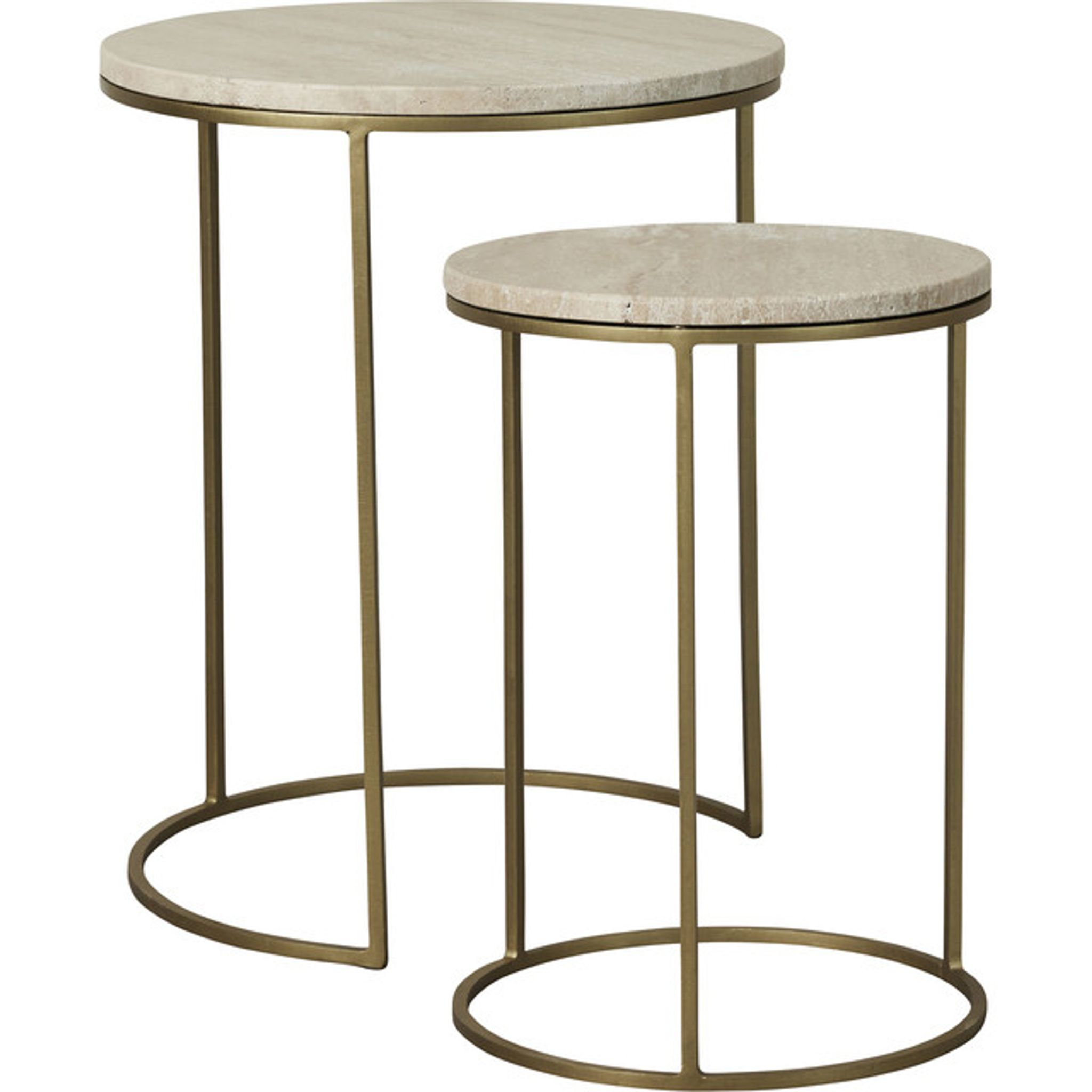 Det här är ett set om två Traville sidobord i travertin med guldfärgade järnben. De passar i vardagsrum, matrum eller på kontoret och ger en modern men klassisk känsla samtidigt som de fungerar som praktiska avlastningsytor i din vardag.