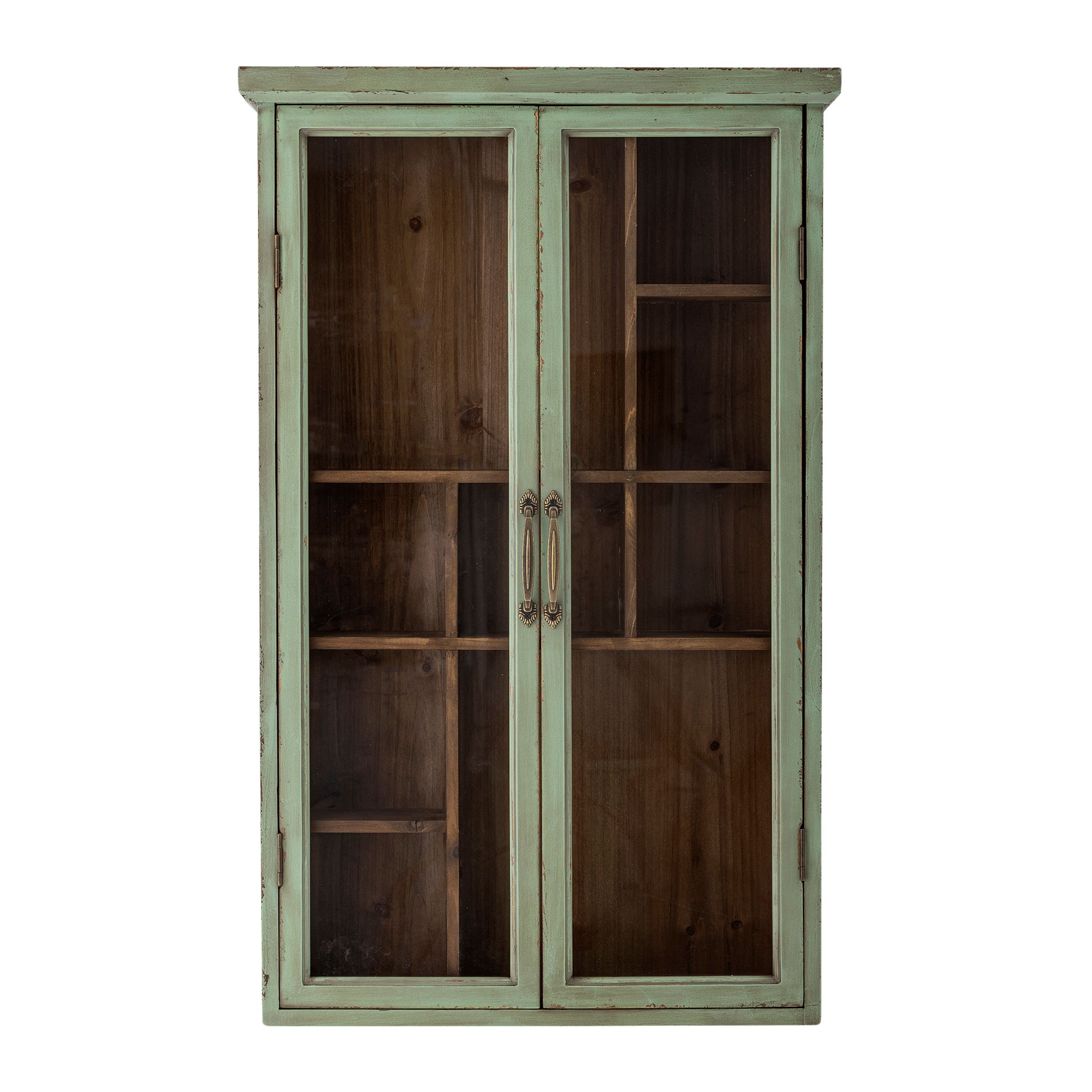 Skåpet är gjort av granträ, järn och MDF med dörrar i härdat glas och är målat i grönt med en sliten ytbehandling. Mått: H80 × B13.5 × D50 cm, vikt 6,33 kg. Varje hyllplan klarar upp till 5 kg.