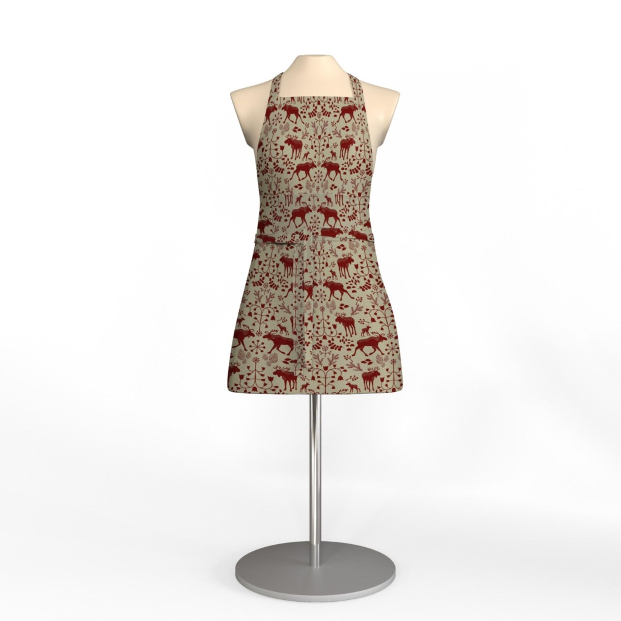 Skogens Konung (culla) röd förkläde med ficka från Arvidssons Textil är ett stilrent, praktiskt och hållbart förkläde i en bomull/polyester-blandning. Designad av Linda Svensson Edevint, med ett iögonfallande rött skogsinspirerat mönster och en praktisk framficka.